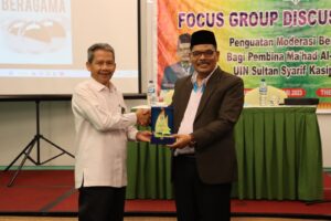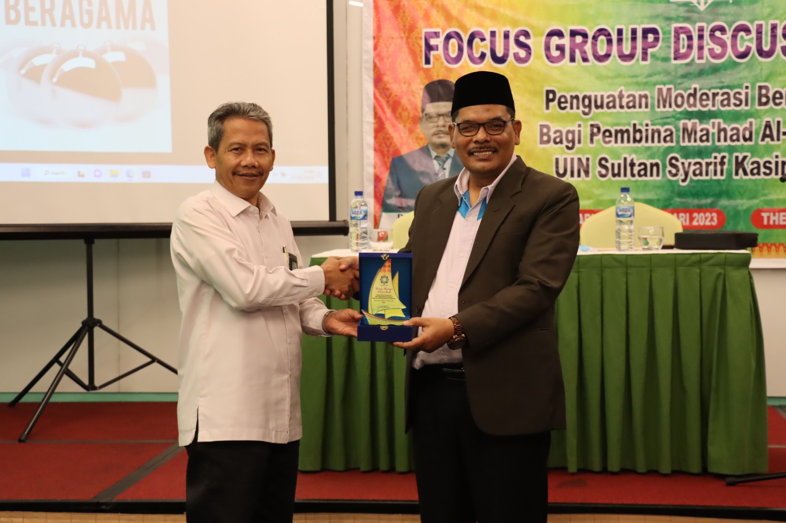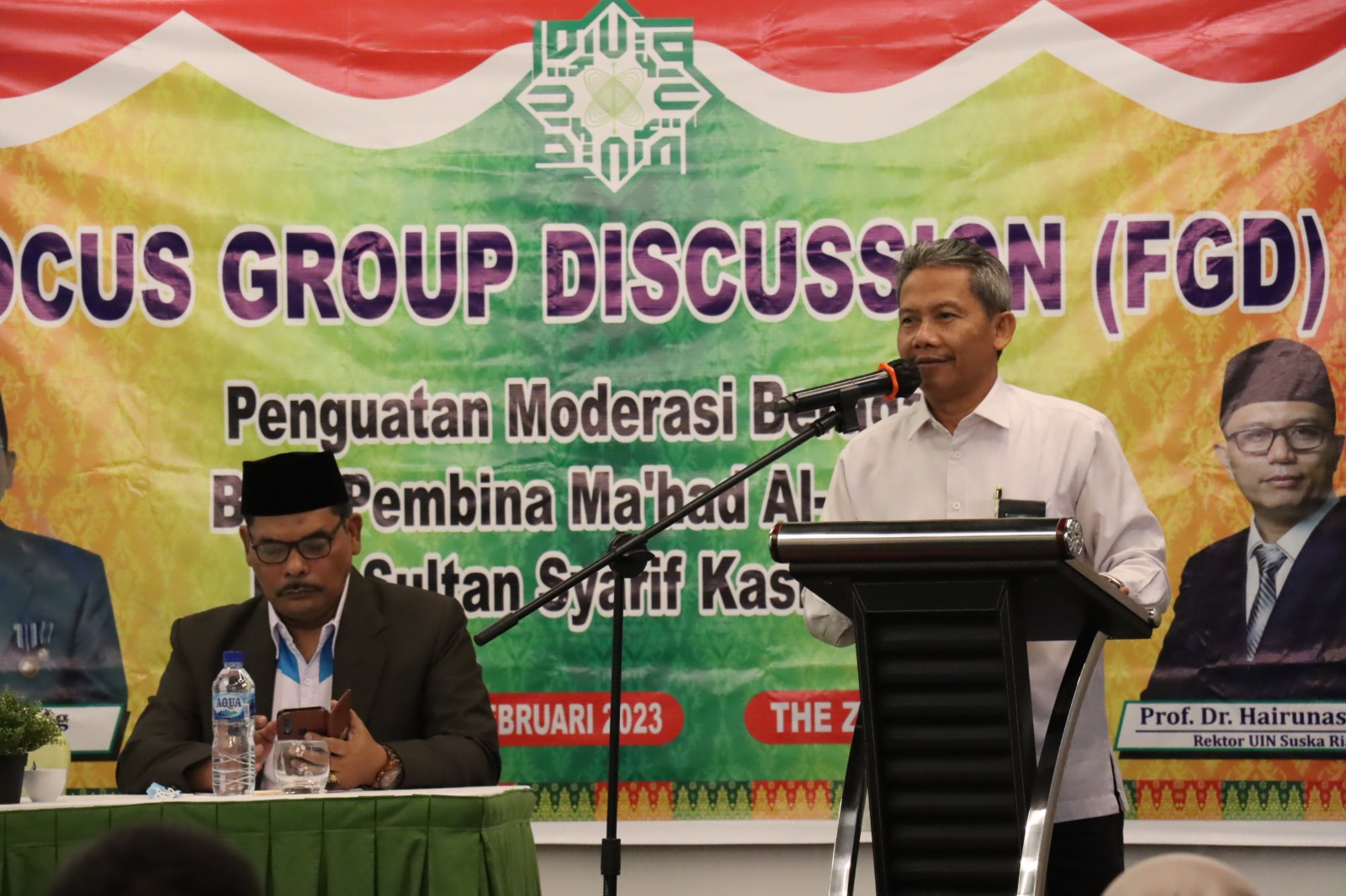 Kegiatan FGD ini secara resmi dibuka oleh Wakil Rektor II UIN Suska Riau, Dr. Mas’ud Zein, M.Pd. Dalam sambutannya beliau menyampaikan apresiasi kepada pimpinan Ma’had Al-Jami’ah UIN Suska Riau yang telah berupaya mengimplementasikan program pemerintah di UIN Suska Riau. “Pada tahun 2019 lalu, UIN Suska Riau dikatakan termasuk kampus yang ekstrim. Melalui kegiatan ini mari kita rubah image tersebut dengan menjadi leader dan virus yang menularkan implementasi moderasi beragama di Indonesia.” Ujar Mas’ud Zein.