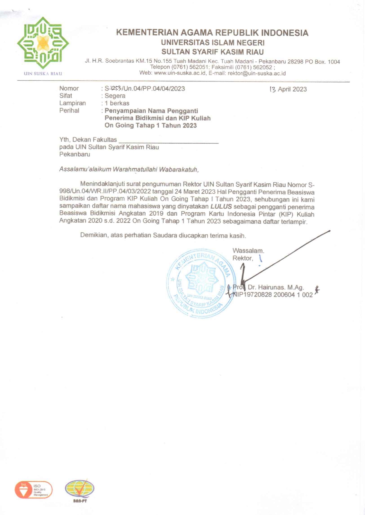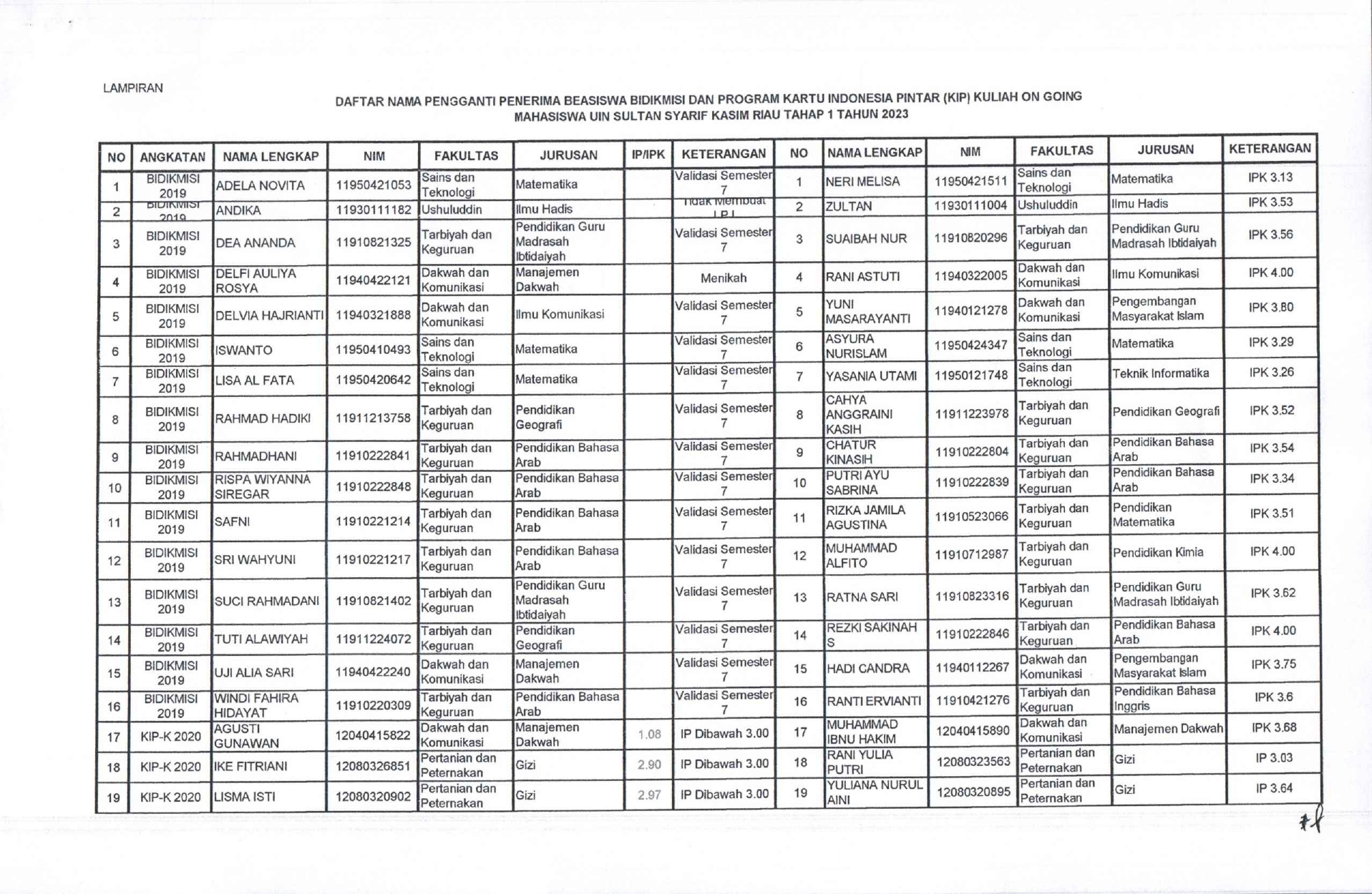 Penyampaian Nama Pengganti Penerima Bidikmisi dan KIP Kuliah On Going Tahap 1 Tahun 2023