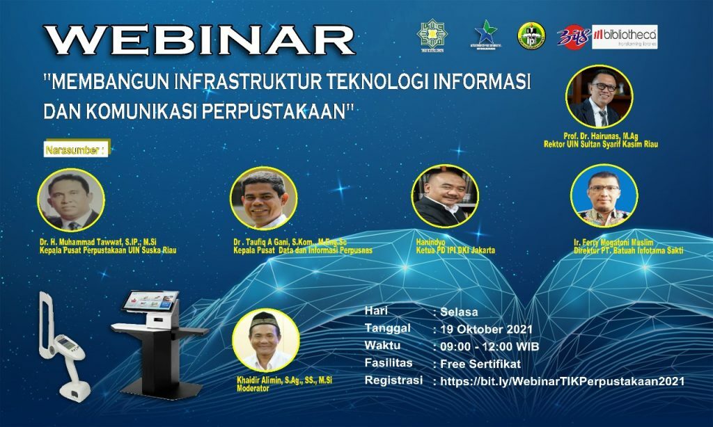Perpustakaan UIN Suska Riau menyelenggarakan kegiatan Webinar dengan tema: “MEMBANGUN INFRASTRUKTUR TEKNOLOGI INFORMASI DAN KOMUNIKASI PERPUSTAKAAN”. Yang diikuti oleh pustakawan di lingkungan perpustakaan perguruan tinggi, Dinas, dan Asosiasi Perpustakaan dan Pustakawan. Kegiatan ini berlangsung pada tanggal 19 Oktober 2021 dimulai pada pukul 09.30 WIB s.d pukul 12.00 WIB. Kegiatan diwali dengan Pengarahan dan dibuka secara...Read More