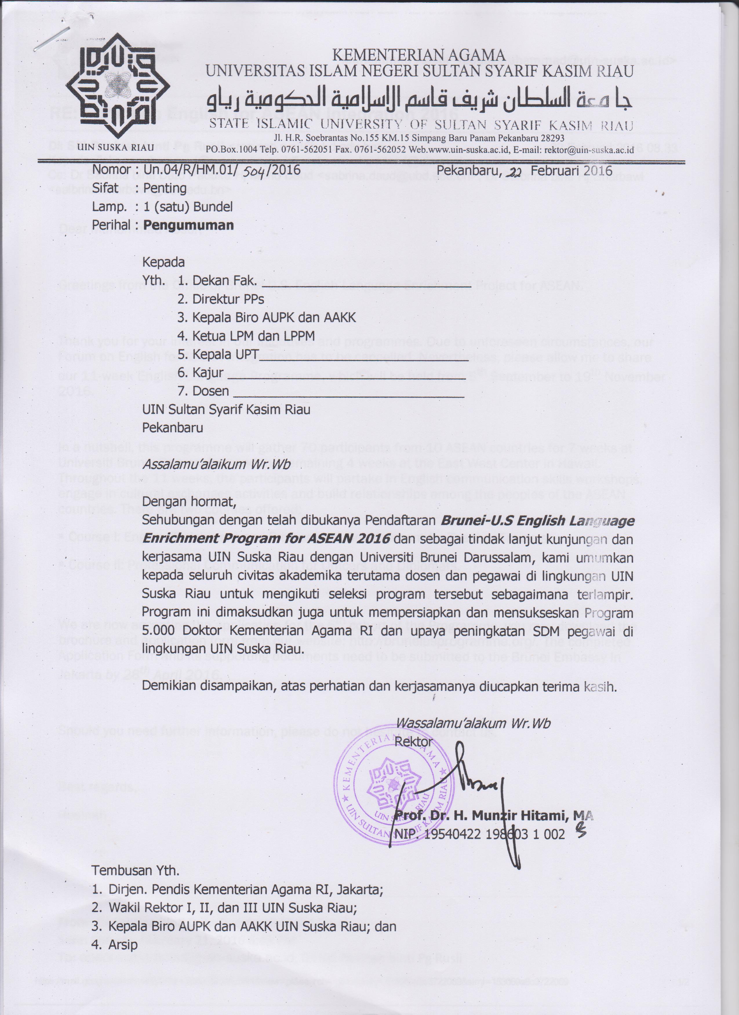 Assalamua’laikum WR.WB Dengan Hormat, Sehubungan dengan telah dibukanya pendaftaran Brunei-U.S. English Language Enrichment Project for ASEAN 2016 dan sebagai tindak lanjut kunjungan dan kerjasama UIN Suska Riau dengan Universiti Brunei Darussalam, kami umumkan kepada seluruh civitas akademika terutama dosen dan pegawai di lingkungan UIN Suska Riau untuk mengikuti seleksi program tersebut sebagaimana terlampir. program ini...Read More