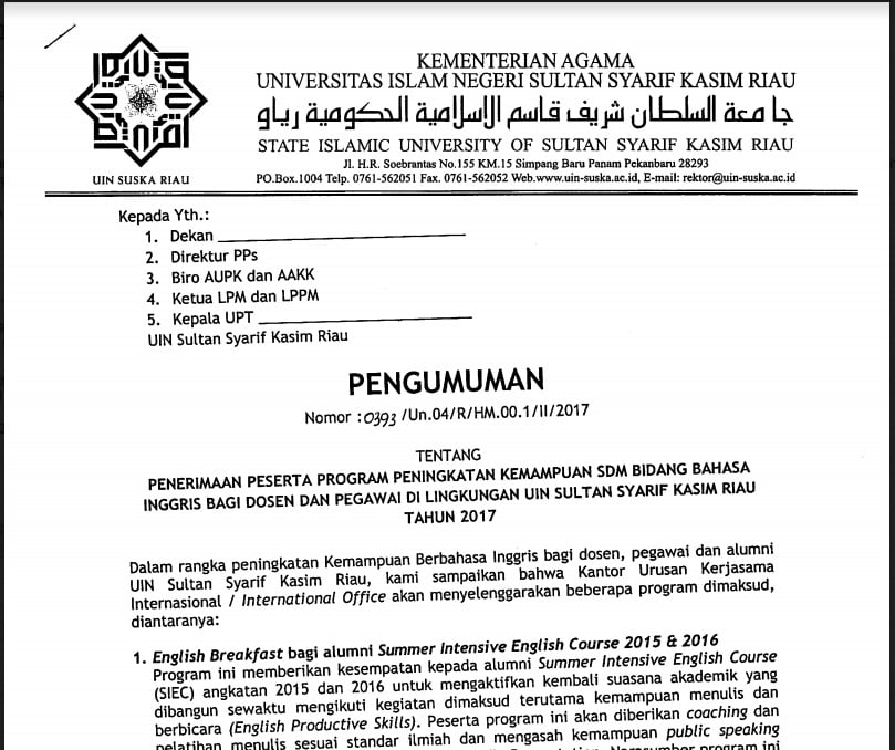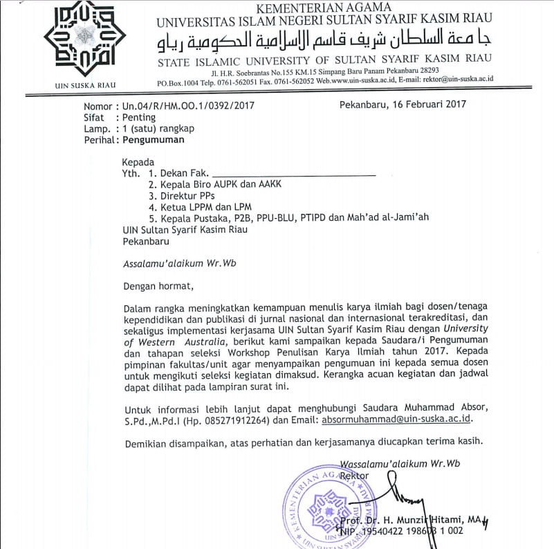 Dalam rangka meningkatkan Kemampuan Menulis Karya Ilmiah Bagi Dosen atau tenaga Kependidikan dan Publikasi di Jurnal Nasional dan Internasional, Kami sampaikan agar semua dosen di UIN Suska Riau untuk megikuti Seleksi Kegiatan yang dimaksud. Untuk lebih lengkap silahkan buka File di bawah ini . PENGUMUMAN UWA 2017Read More