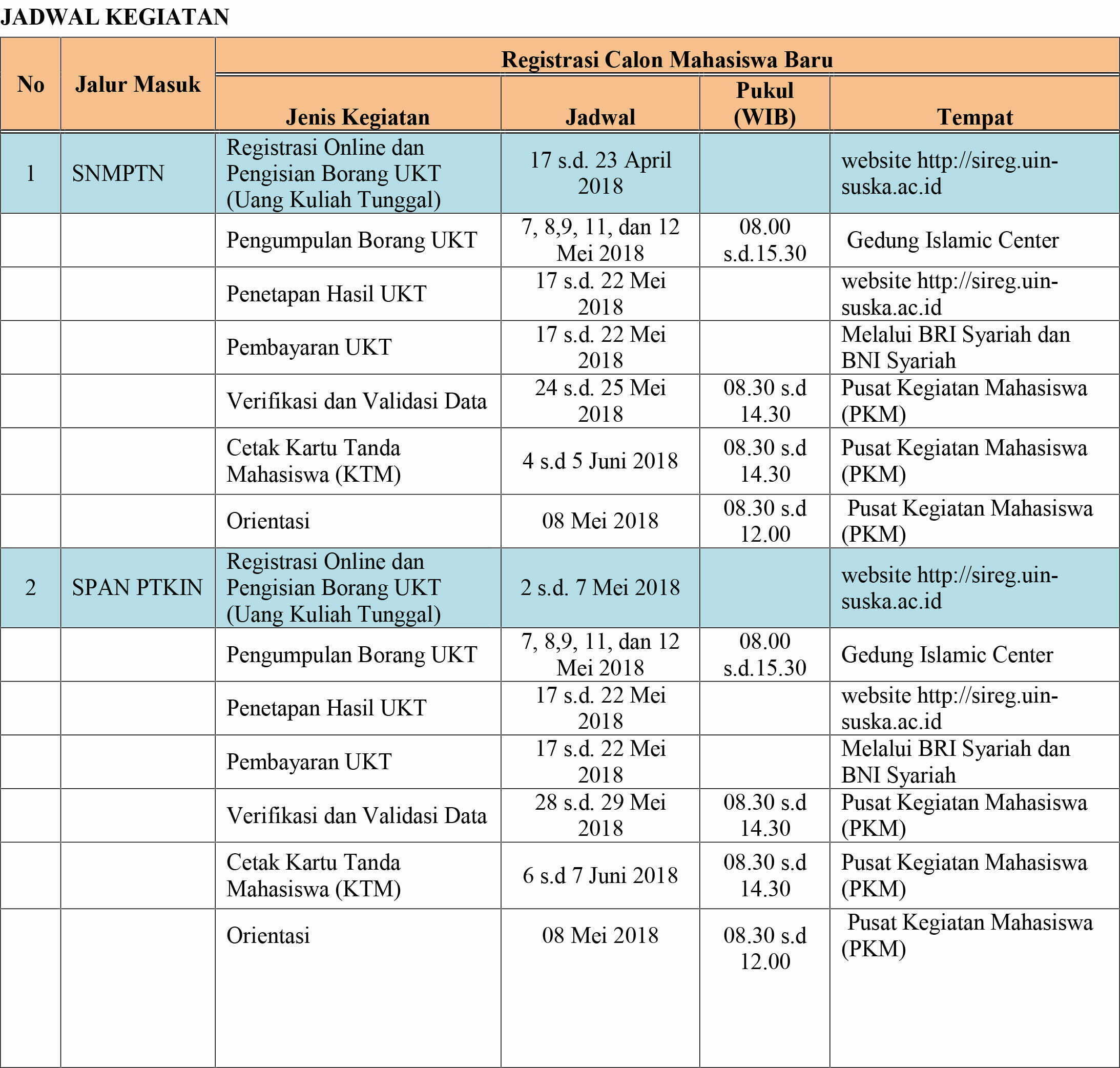 Dari : Rektor UIN Sultan Syarif Kasim Riau Kepada : Calon Mahasiswa Baru UIN Sultan Syarif Kasim Riau Tahun Akademik 2018/2019 Hal : Jadwal Kegiatan Calon Mahasiswa Baru TA. 2018/2019 Download File Pengumuman disini <<< Read More