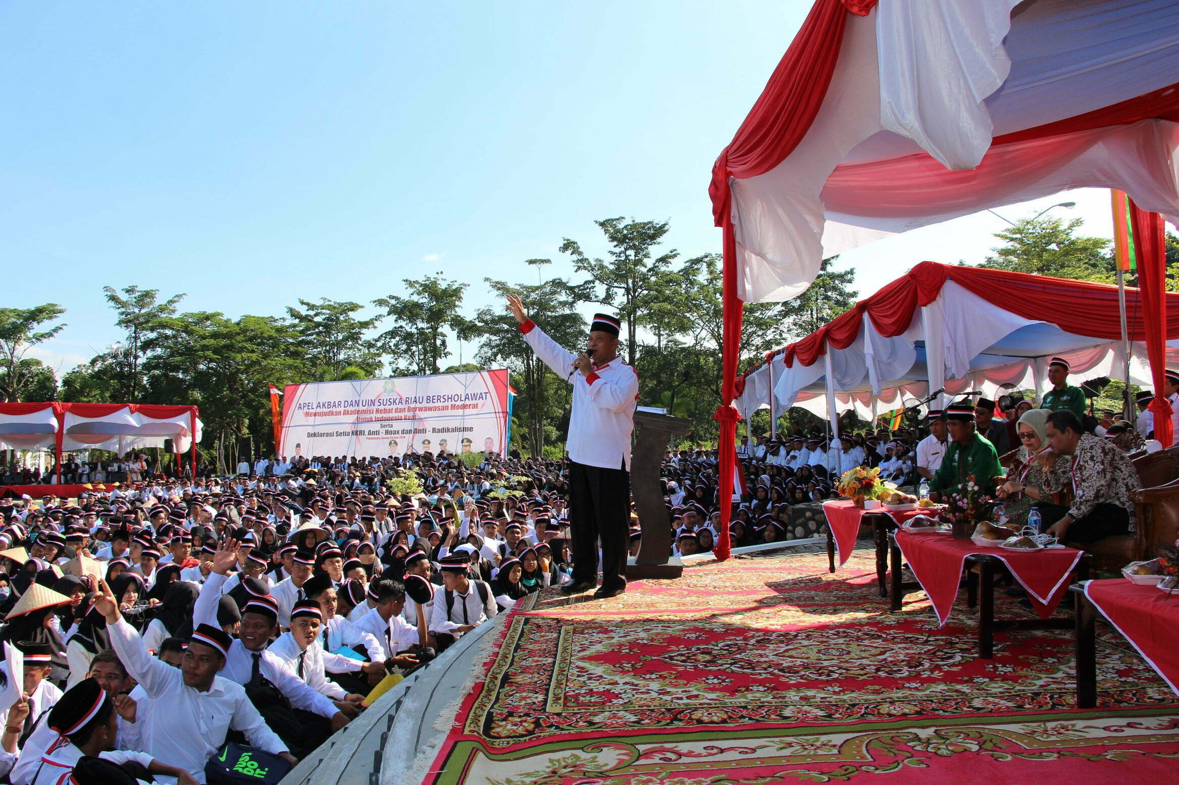 Kegiatan Apel Akbar dan UIN Suska Bershalawat mewujudkan Akademisi Hebat dan Berwawasan Moderat untuk Indonesia Kuat serta Deklarasi Setia NKRI, Anti-Hoax dan Anti-Radikalisme Bersama Forkompinda Provinsi Riau merupakan rangkaian Acara pembukaan PBAK Mahasiswa baru UIN Suska Riau yang dilaksanakan pada Kamis (26/7/2018) di Lapangan Rektorat UIN Suska Riau. Dokumentasi Humas UIN Suska RiauRead More