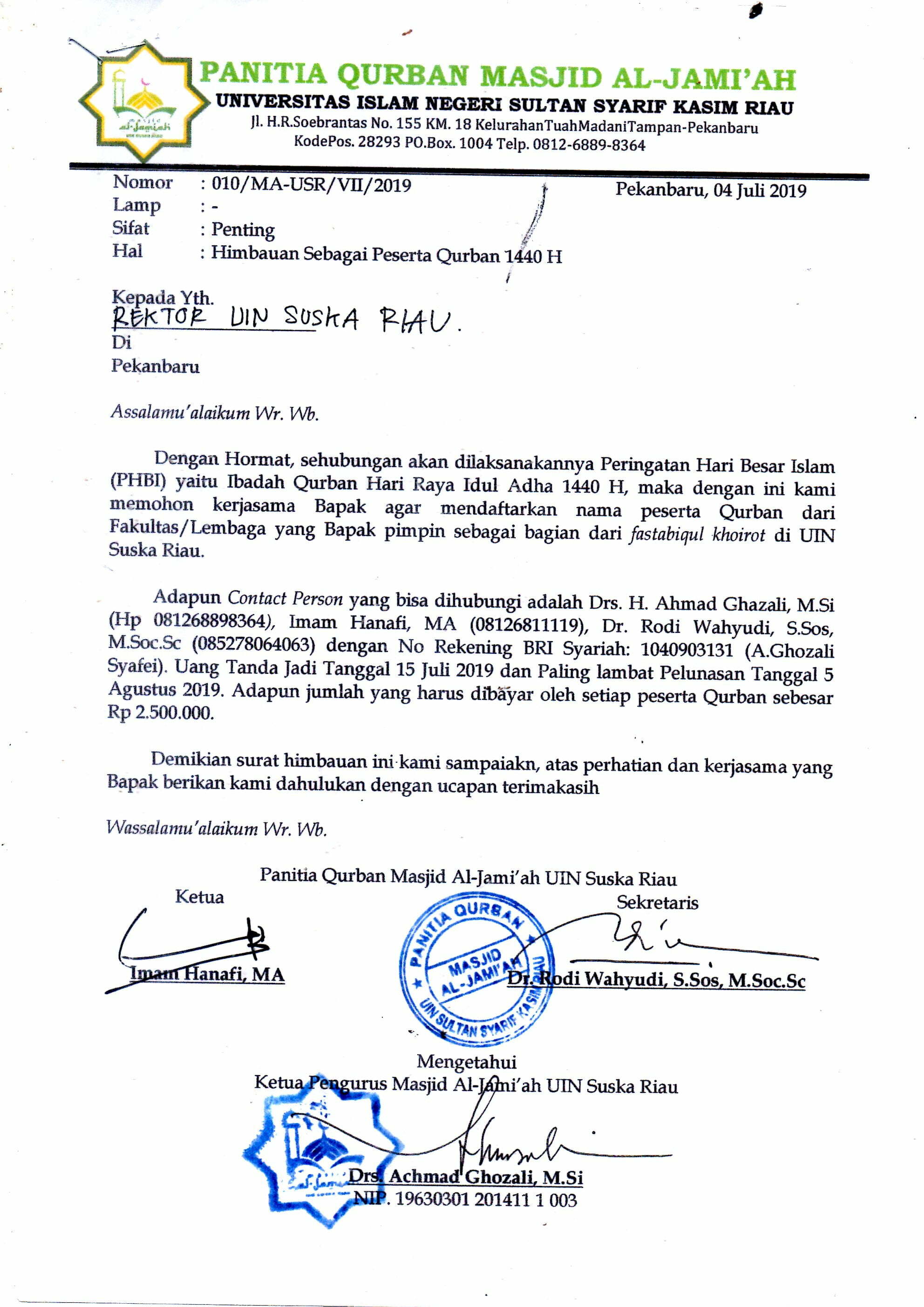 DAlam rangka memperingati Hari Besar Islam yaitu ibadah Qurban Hari Raya Idul Fitri 1440 H, maka kami memohon kerjasama Bapak agar mendaftarkan nama peserta Qurban dari Fakultas/Lembaga di UIN suska Riau. Adapun Contact Person yang bisa dihubungi adalah Drs. H. Ahmad Ghazali, M.Si (HP 081268898364), Imam Hanafi, MA (08126811119), Dr. Rodi Wahyudi, S.Sos M.Soc.Sc (085278064063)...Read More