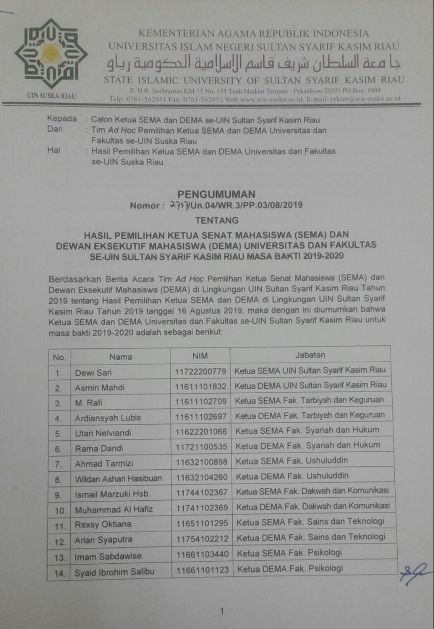 PENGUMUMAN Nomor : 2757/Un.04/WR.3/PP.03/08/2019 Tentang Hasil Pemilihan Ketua Senat Mahasiswa (SEMA) dan Dewan Eksekutif Mahasiswa (DEMA) Universitas dan Fakultas Se-UIN Sultan Syarif Kasim Riau Masa Bakti 2019-2020 Berdasarkan Berita Acara Tim Ad Hoc Pemilihan Ketua Senat Mahasiswa (SEMA) dan Dewan Eksekutif MAhasiswa (DEMA) di Lingkungan UIN Sultan Syarif Kasim Riu Tahun 2019 tentang Hasil Pemilihan Ketua...Read More