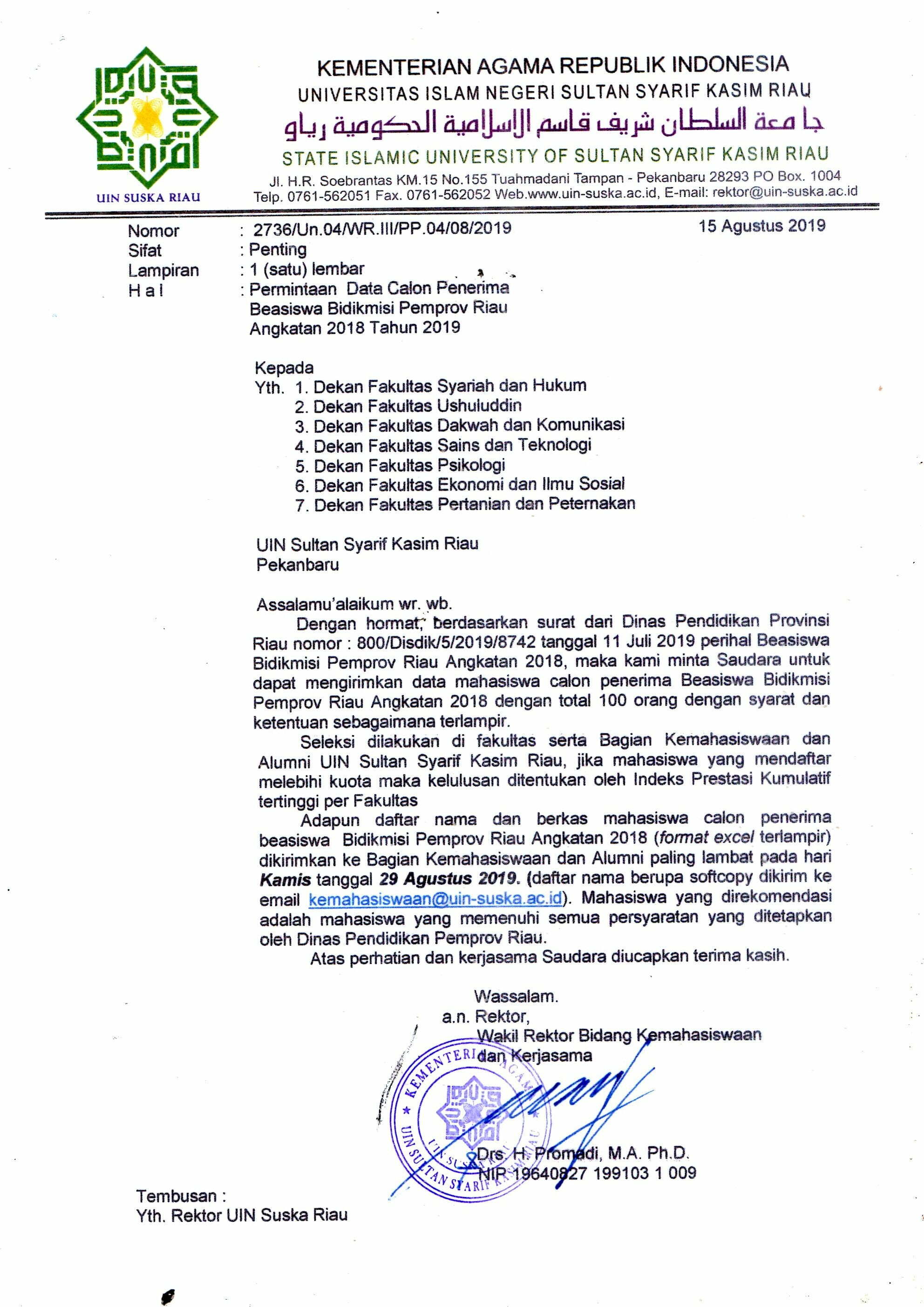 Kepada : Dekan Fakultas Syariah dan Hukum, Dekan Fakultas Ushuluddin, Dekan Fakultas Dakwah dan Komunikasi, Dekan Fakultas Sains dan Teknologi, Dekan Fakultas Psikologi, Dekan Fakultas Ekonomi dan Ilmu Sosial dan Dekan Fakultas Pertanian dan Peternakan Assalamualaikum Warahmatullahi Wabaraktuh, Dengan hormat, berdasarkan surat dari Dinas Pendidikan Provinsi Riau Nomor : 800/Disdik/5/2019/8742 tanggal 11 Juli 2019...Read More