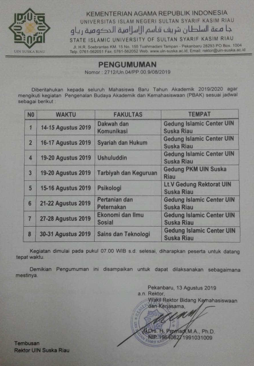 Diberitahukan kepada seluruh Mahasiswa Baru Tahun Akademik 2019/2020 agar mengikuti kegiatan Pengenalan Budaya Akademik dan Kemahasiswaan (PBAK) sesuai jadwal sebagai berikut : Kegiatan Dimulai pada pukul 07.00 WIB s.d SelesaiRead More