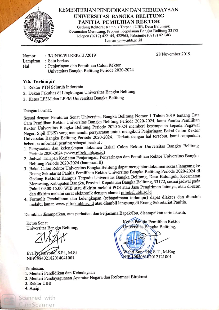 Kami Beritahukan kepada seluruh Dosen PNS UIN Suska Riau bahwa Universitas Bangka Belitung memberikan kesempatan kepada Dosen PNS UIN Suska Riau yang memenuhi persyaratan untuk mengikuti Penjaringan Bakal Calon Rektor Universitas Bangka Belitung Periode 2020-2024. Informasi Penting Persyaratan dan kelengkapan dokumen bakal calon Rektor Universitas Bangka Belitung periode 2020-2024 (www.pilrek.ubb.ac.id) Jadwal Pemilihan Penjaringan Bakal Calon...Read More