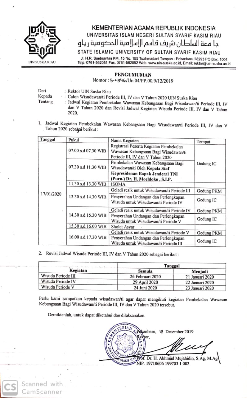 Jadwal Kegiatan Pembekalan Wawasan Kebangsaan Bagi Wisudawan/ti Periode III, IV dan V Tahun 2020 sebagai berikut : Tanggal : 17 Januari 2019 07.00 – 07.30 Registrasi Peserta Kegiatan Pembekalan Wawasan Kebangsaan Bagi Wisudawan/ti Periode III, IV dan V Tahun 2020 : Gedung IC 07.30- 11.30 Pembekalan Wawasan Kebangsaan Bagi Wisudawan/ti oleh Kepala Staf Keperesidenan Bapak...Read More