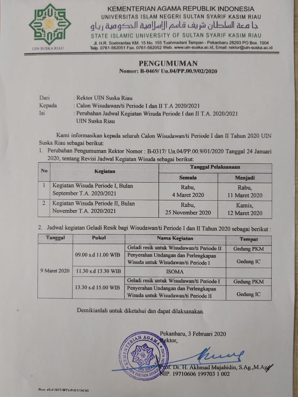 - Kegiatan Wisuda Periode I Bulan September TA 2020/2021 Semula : Rabu, 4 Maret 2020 Menjadi Rabu, 11 Maret 2020