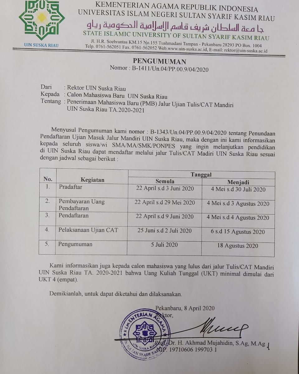 uin-suska.ac.id Terkait dengan telah ditetapkannya Kota Pekanbaru sebagai zona merah dan mendapat persetujuan oleh Kementerian Kesehatan Republik Indonesia ( Kemenkes RI) untuk menerapkan Pembatasan Sosial Berskala Besar (PSBB) di Kota Pekanbaru yang dimulai Jum’at (17/4/2020) selama 15 hari kedepan. Rektor UIN Suska Riau bersama dengan tim gugus tugas percepatan penanganan COVID 19 UIN Suska Riau...Read More