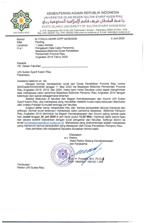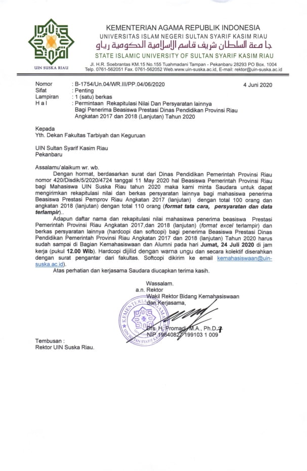 PENGUMUMAN Nomor: B-188S/Un.04/PP.OS/06/2020 Rektor UIN Sultan Syarif Kasim Riau Tentang : Keringanan Uang Kuliah Tunggal (UKT) Atas Dampak Bencana Wabah Covid-19 A. DASAR 1. Keputusan Menteri Agama RI Nomor 515 Tahun 2020 Tanggai 12 Juni 2020, tentang Keringanan Uang Kuliah Tunggal (UKT) Perguruan Tinggi Keagamaan Negeri Atas Oampak Bencana Wabah Covid-19. 2. SK Rektor Universitas...Read More