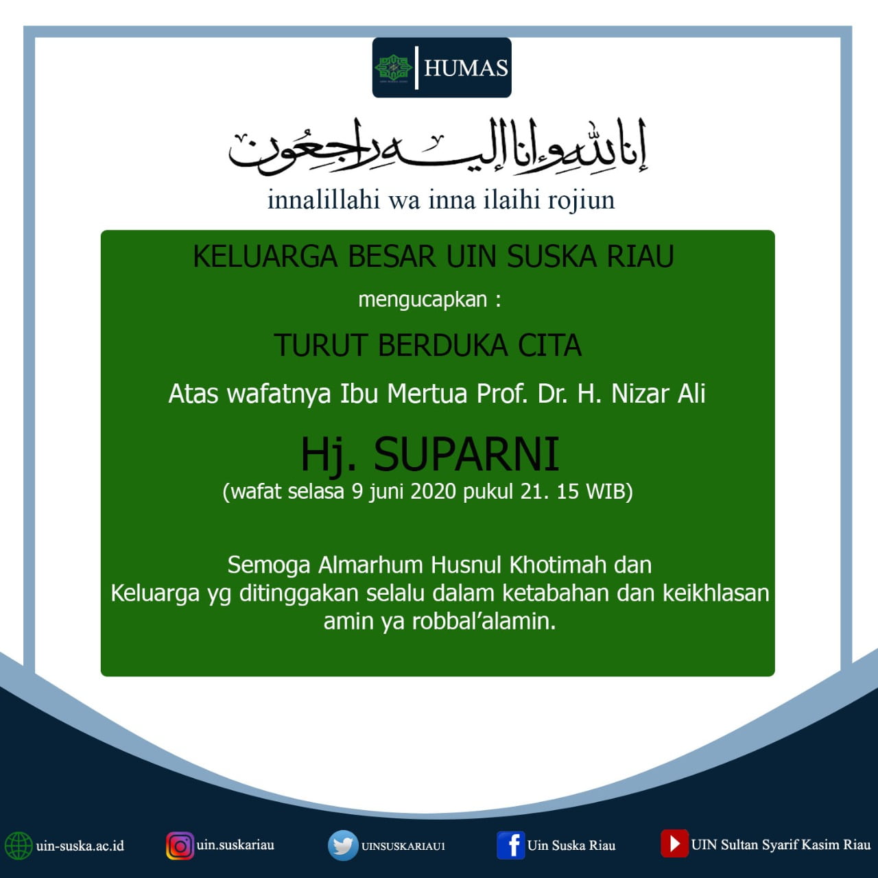 Innalillahi wa inna ilaihi rojiun. Keluarga Besar UIN Suska Riau Turut berduka cita yang mendalam atas meninggalnya Ibu Hj. Suparni (Ibu Mertua Prof Dr H Nizar Ali) pada Selasa 9 Juni 2020 Pukul 21.15 WIB di rumah Daren Nalumsari Jepara Jateng. Dimakamkan Rabu 10 Juni 2020 Pukul 14.00 WIB. Semoga almarhumah husnul khotimah, mendapatkan Surga-Nya...Read More