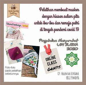 uin-suska.ac.id Menyikapi situasi pandemi Covid 19, yang mengakibatkan kegiatan berkumpul tidak dianjurkan, Pusat Studi gender dan Anak (PSGA) UIN Suska Riau tetap bergerak memberdayakan masyarakat lewat pelatihan-pelatihan yang bersifat virtual/online. Seiring dengan kebutuhan sekarang ini, kegiatan pemberdayaan masyarakat yang dilaksanakan adalah pelatihan membuat masker yang berhias sulaman tangan (handmade). Menurut Sukma Erni, Ketua PSGA UIN...Read More