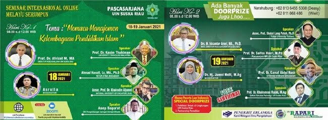 uin-suska.ac.id Program Pascasarjana UIN Sultan Syarif Kasim (Suska) Riau taja Seminar Internasional Melayu Serumpun. Mengingat kita masih dalam masa new normal dari covid-19 maka kegiatan ini dilaksanakan secara online. Acara yang digelar selama dua hari ini, tanggal 18 s/d 19 Januari 2021 mengangkat tema Memacu Manajemen Kelembagaan Pendidikan Islam dengan menghadirkan narasumber dari Indonesia, Malaysia,...Read More