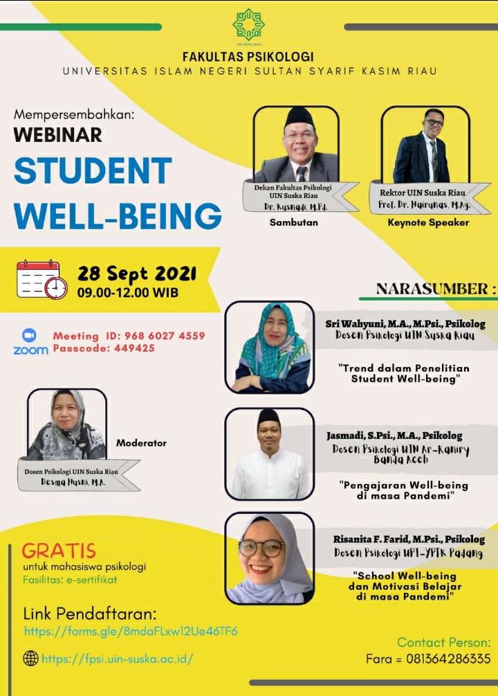 uin-suska.ac.id Selasa 28 September 2021 Fakultas Psikologi UIN Suska Riau taja webinar via zoom meeting dengan mengangkat tema” Students Well Being” . Webinar nasional kali ini merupakan bentuk tindak lanjut kerjasama antara UIN Suska Riau dengan UIN ar Raniry Banda Aceh dan UPI YPTK padang. Acara webinar yang di selenggarakan secara virtual ini di mulai...Read More