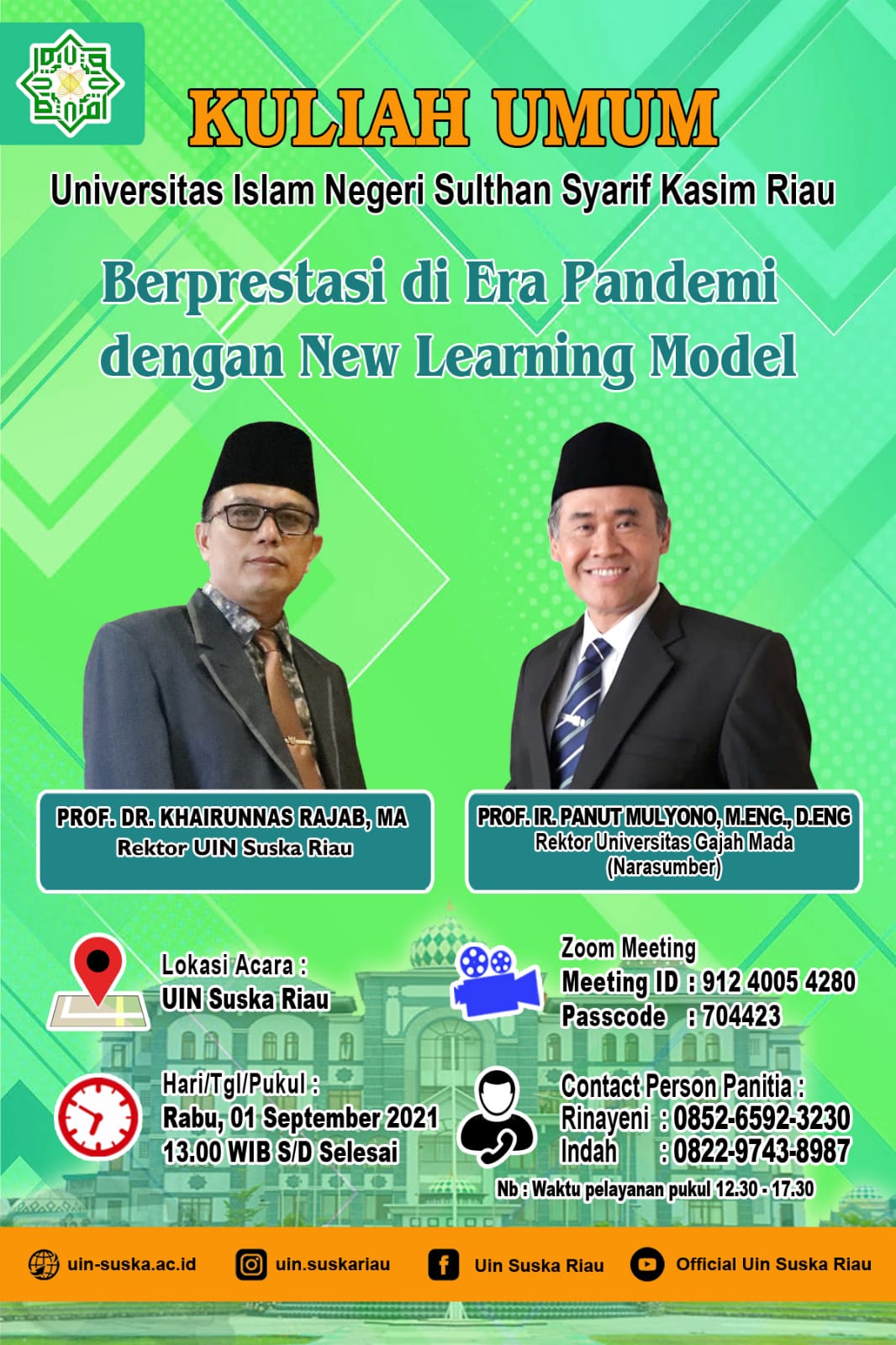 uin-suska.ac.id Menandai masuknya semester ganjil Tahun Akademik 2021/2022, UIN Suska Riau melalui Bagian Akademik menyelenggarakan Kuliah Umum dengan tema Berprestasi di Era Pandemi dengan New Learning Model, Rabu (1/9/2021).