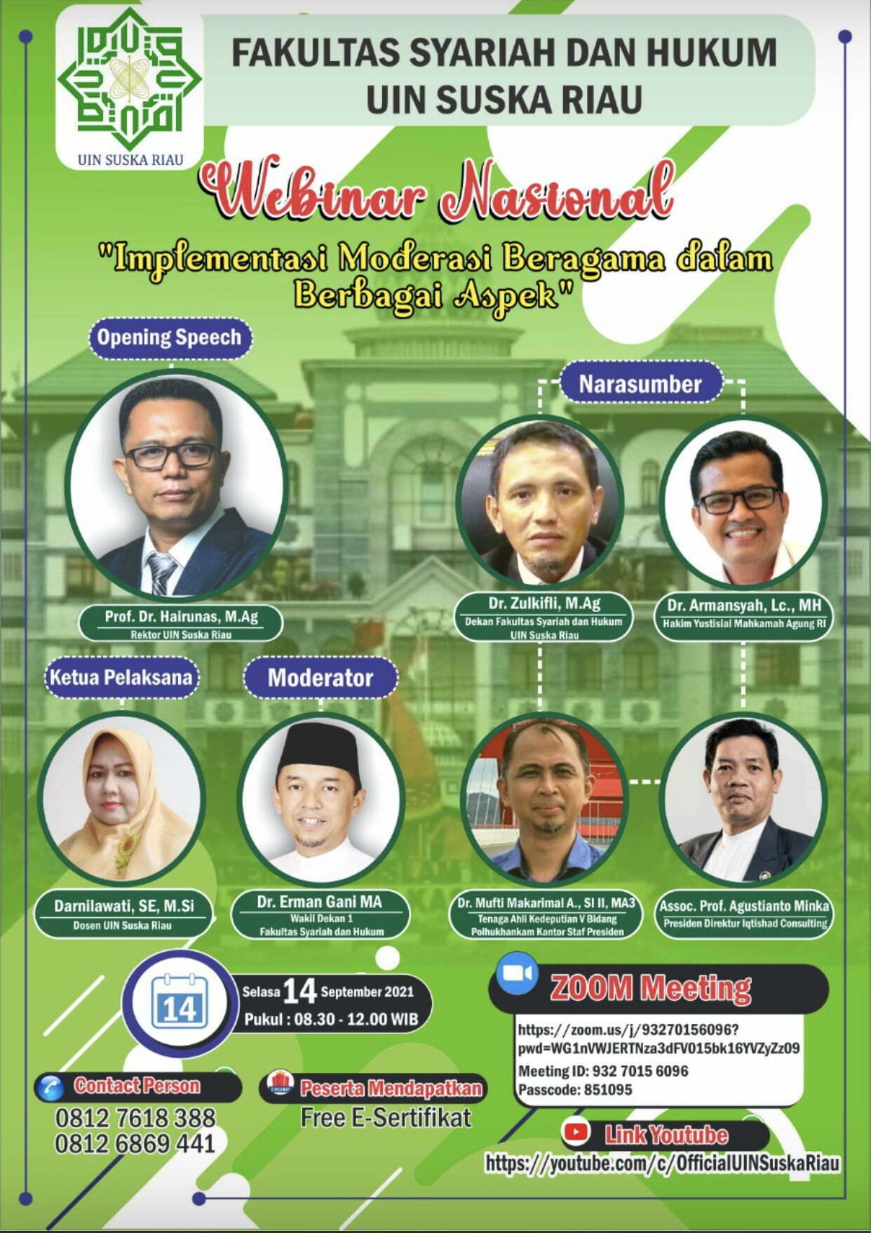 uin suska.ac.id Rektor UIN Suska Riau Prof. Dr. Hairunnas, M.Ag kembali membuka secara resmi webinar nasional yang ditaja oleh Fakultas Syariah Dan Hukum UIN Suska Riau bertajuk “Implementasi Moderasi Beragama Dalam Berbagai Aspek” yang diselenggarakan pada Selasa (14/9/2021). Kegiatan yang berpusat dilantai Tiga Pusat Teknologi Informasi dan Pangkalan Data (PTIPD) dihadiri oleh Rektor UIN Suska,...Read More