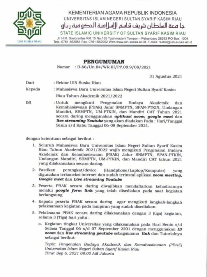 uin-suska.ac.id Universitas Islam Negeri Sultan Syarif Kasim kembali menggelar kegiatan Pengenalan Budaya Akademik dan Kemahasiswaan Tingkat Universitas kegiatan ini di laksanakan secara online dan offline melalui aplikasi Zoom dan live streaming di youtube official UIN Suska Riau dilaksanakan pada hari senen dan selasa yang di laksana selama dua hari tanggal 6 sd 7 September 2021...Read More
