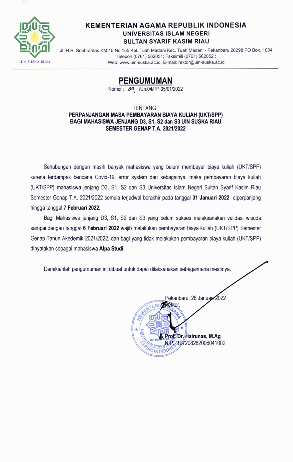 uin-suska.ac.id Rektor UIN Suska Riau didampingi oleh Wakil Rektor Bidang Administrasi Umum, Perencanaan dan Keuangan, para dekan, Ketua BLU, Ketua SPI, bagian perencanaan dan bagian keuangan UIN Suska Riau menghadiri rapat pembahasan Kontrak Kinerja Tahun 2022 dan capaian tahun 2021 Pemimpin BLU Pendidikan Lingkup Kementrian Agama secara virtual yg berpusat di lantai IV ruang rapat...Read More