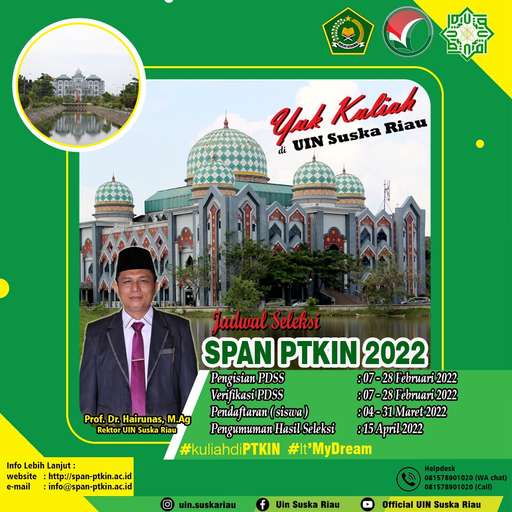 UIN Suska Riau melalui Jalur Seleksi Prestasi Akademik Nasional-Ujian Masuk Perguruan Tinggi Keagamaan Islam Negeri (SPAN-UM PTKIN) menawarkan 21 jurusan yang bisa dipilih yaitu: 1. Pendidikan Agama Islam 2. Pendidikan Bahasa Arab 3. Pendidikan Bahasa Inggris 4. Manajemen Pendidikan Islam 5. Pendidikan Guru Madrasah Ibtidaiyah (PGMI) 6. Pendidikan Guru Raudhatul Athfal 7. Tadris Ilmu Pengetahuan...Read More