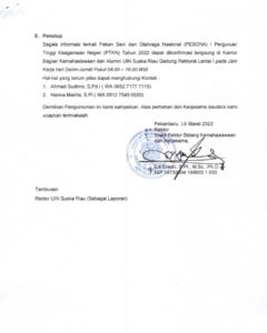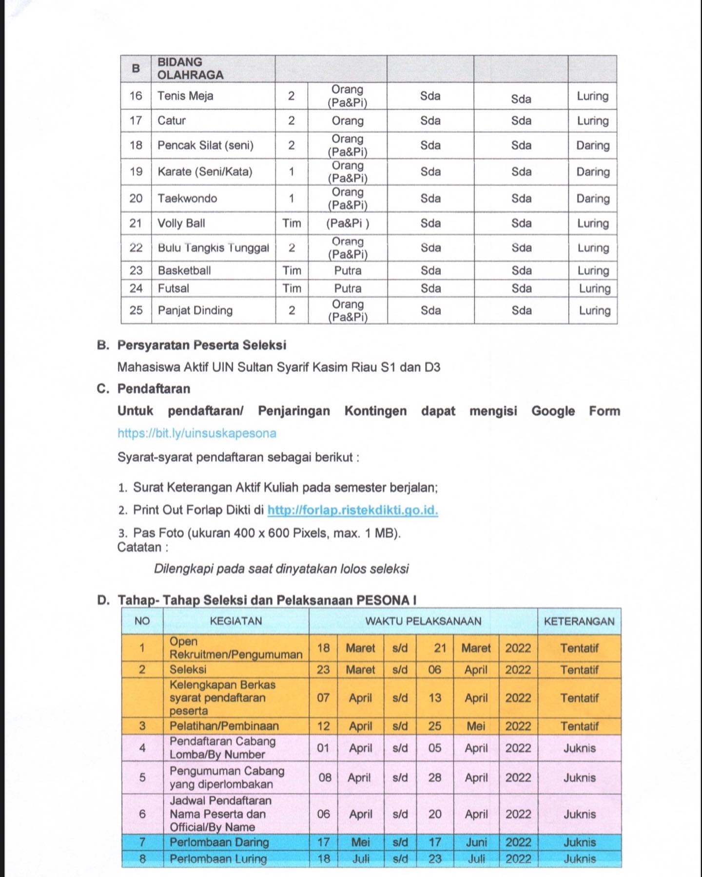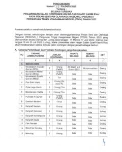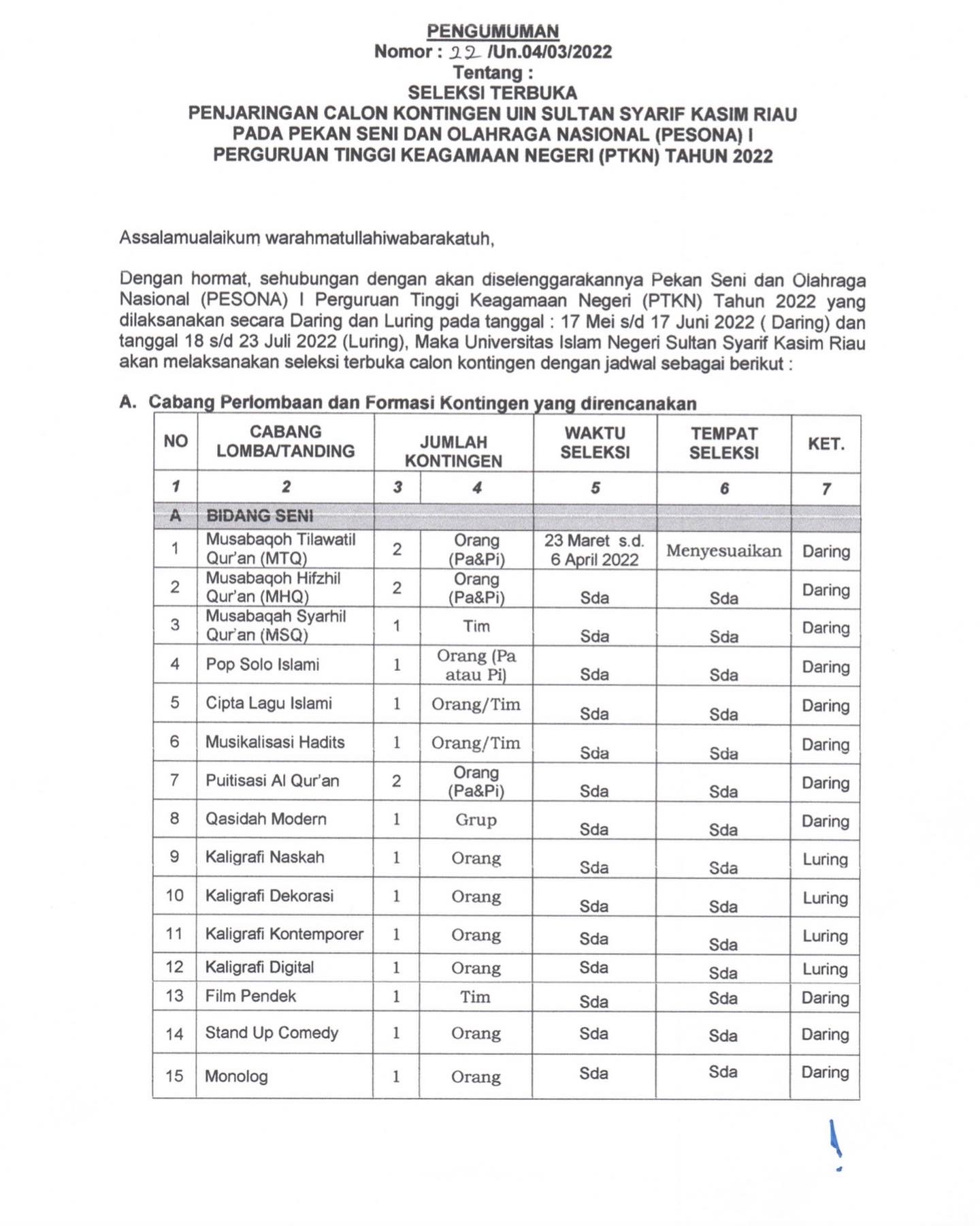 Seleksi Terbuka Penjaringan Calon Kontingen UIN Sultan Syarif Kasim Riau Pada Pekan Seni dan Olahraga Nasional (Persona) I Perguruan Tinggi Keagamaan Negeri (PTKN) Tahun 2022