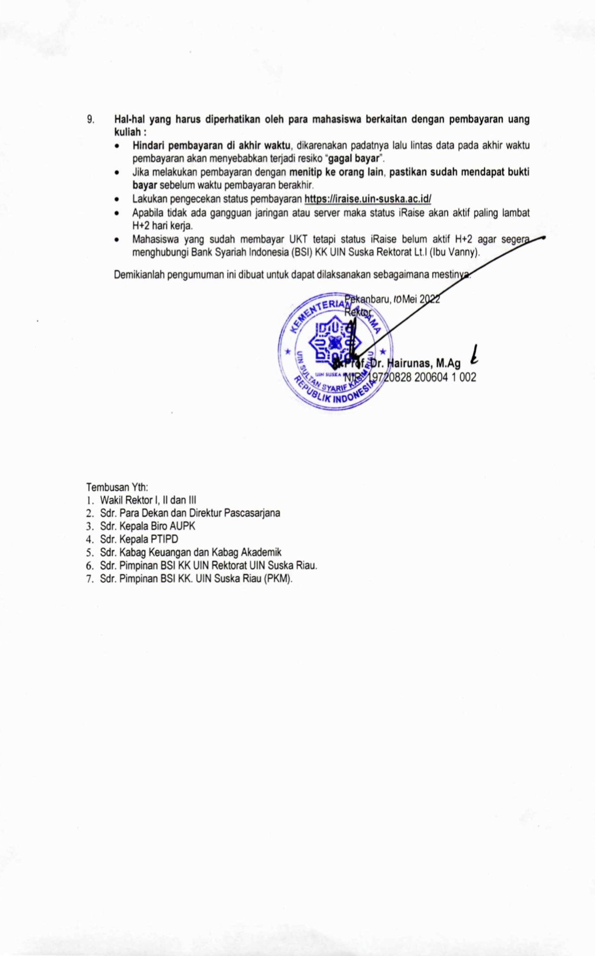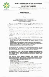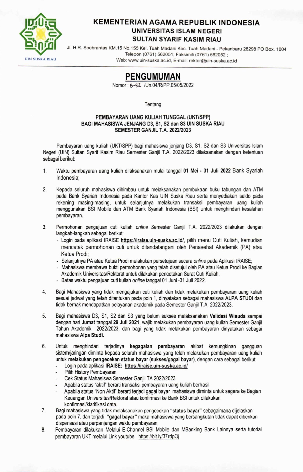 Pembayaran Uang Kuliah Tunggal (UKT/SPP) Bagi Mahasiswa Jenjang D3, S1, S2 dan S3 UIN Suska Riau Semester Ganjil T.A 2022/2023