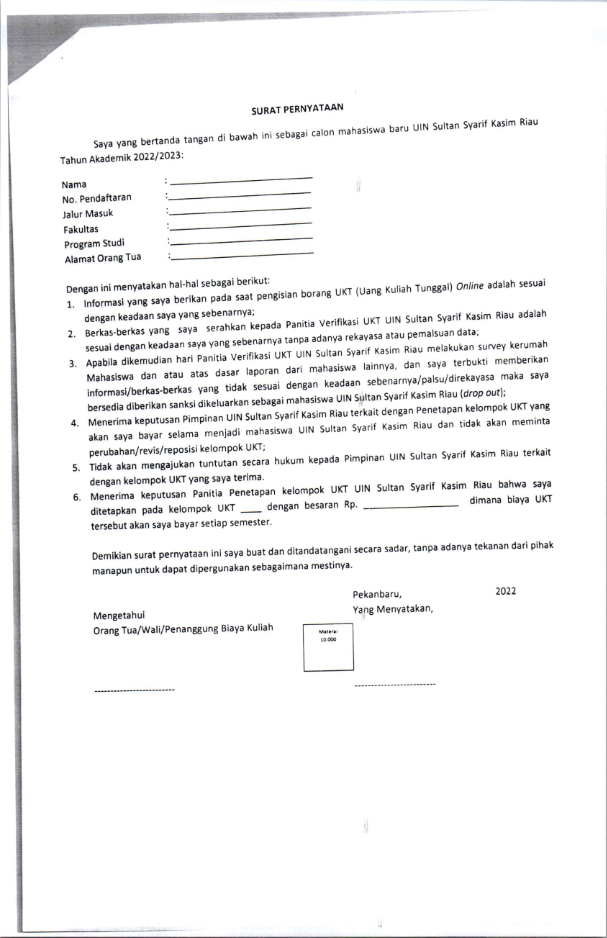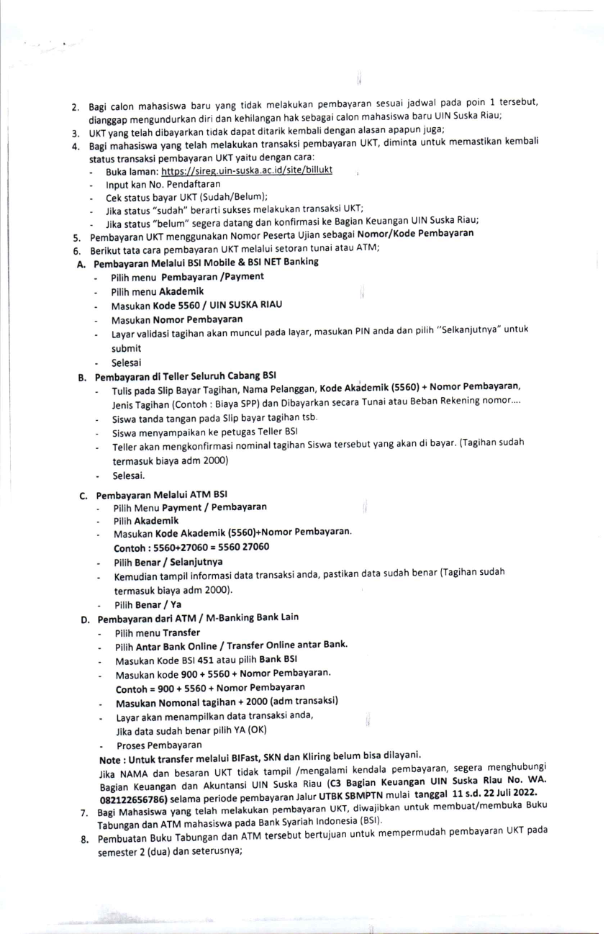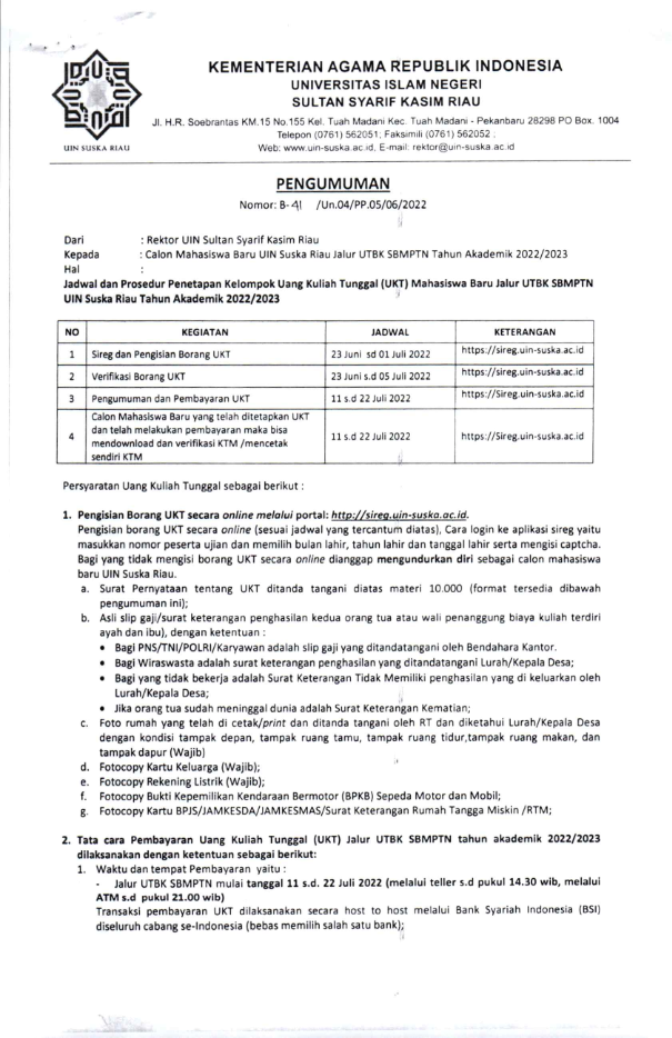 Jadwal dan Prosedur Penetapan Kelompok Uang Kuliah Tunggal (UKT) Mahasiswa Baru Jalur UTBK SBMPTN UIN Suska Riau Tahun Akademik 2022/2023