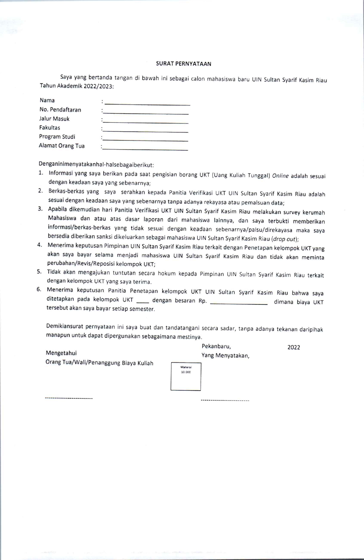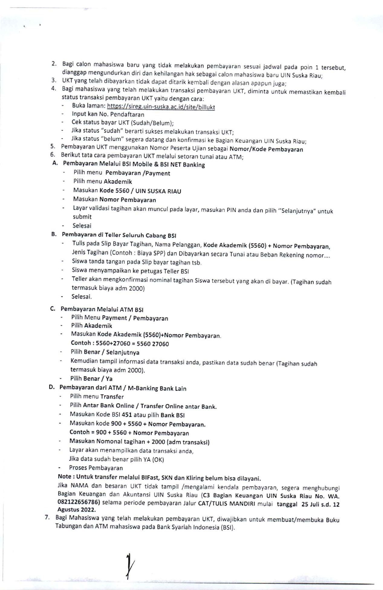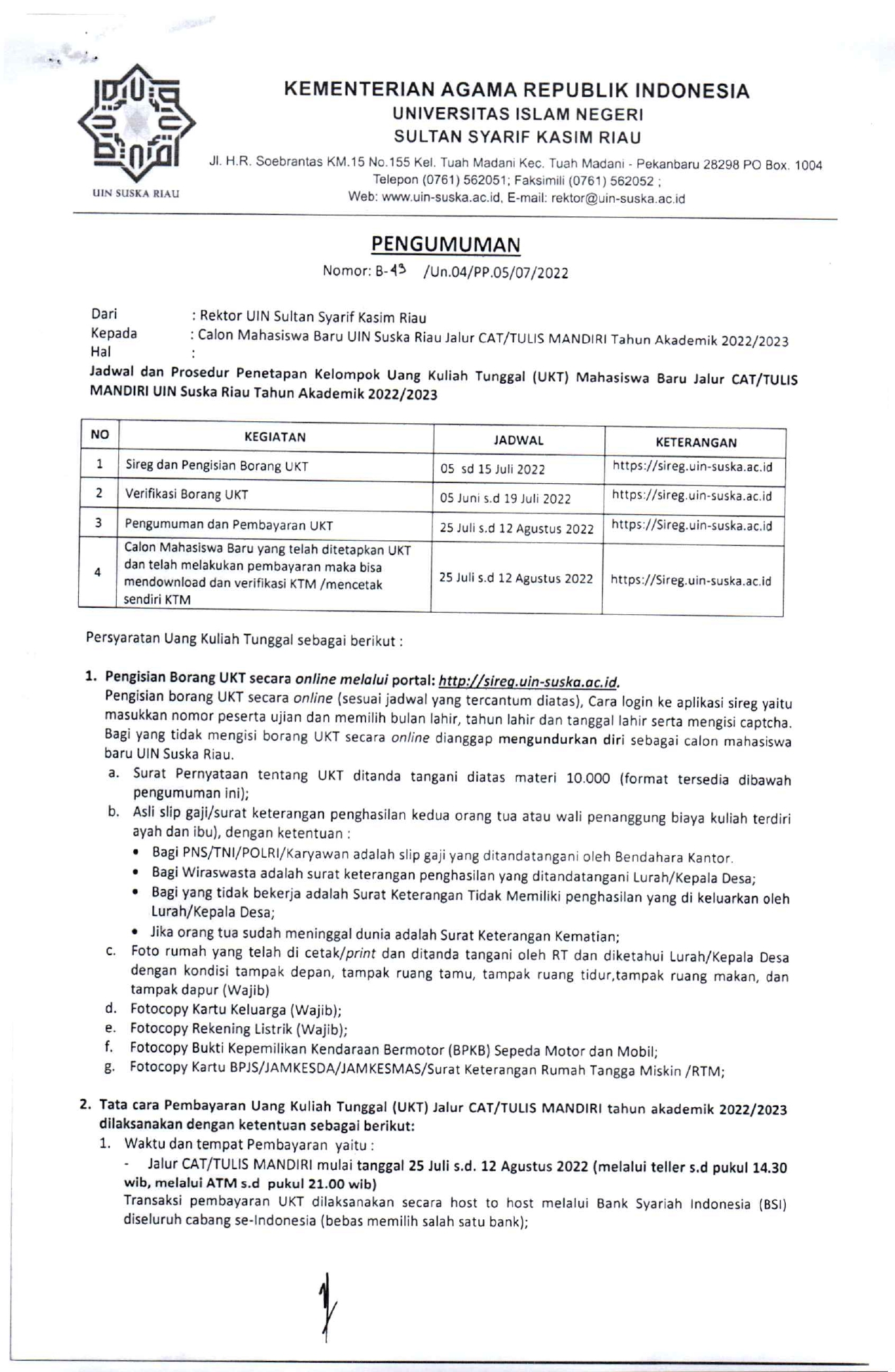 Jadwal dan Prosedur Penetapan Kelompok Uang Kuliah Tunggal (UKT) Mahasiswa Baru Jalur CAT/TULIS MANDIRI UIN Suska Riau Tahun Akademik 2022/2023