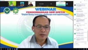 Ketua Umum APPTIS yang diwakili oleh Wakil Ketua Umum APPTIS Aris Nurrohman, M.Hum, membuka kegiatan ini secara daring. Dalam sambutannya Aris Nurrohman menyampaikan bahwa perpustakaan dan pustakawan harus mampu berbadaptasi dengan teknologi, stigma perpustakaan yang masih terbatas oleh ruang dan waktu harus diubah dengan cara pengembangan diri pustakawan dan perpustakaan. Selain itu pustakawan harus mampu melakukan penelitian, agar kedepannya pustakawan dapat membantu para peneliti yang akan melakukan penelitian terutama berkaitan dengan sumber-sumber referensi dan informasi, tegas Aris Nurrahman.