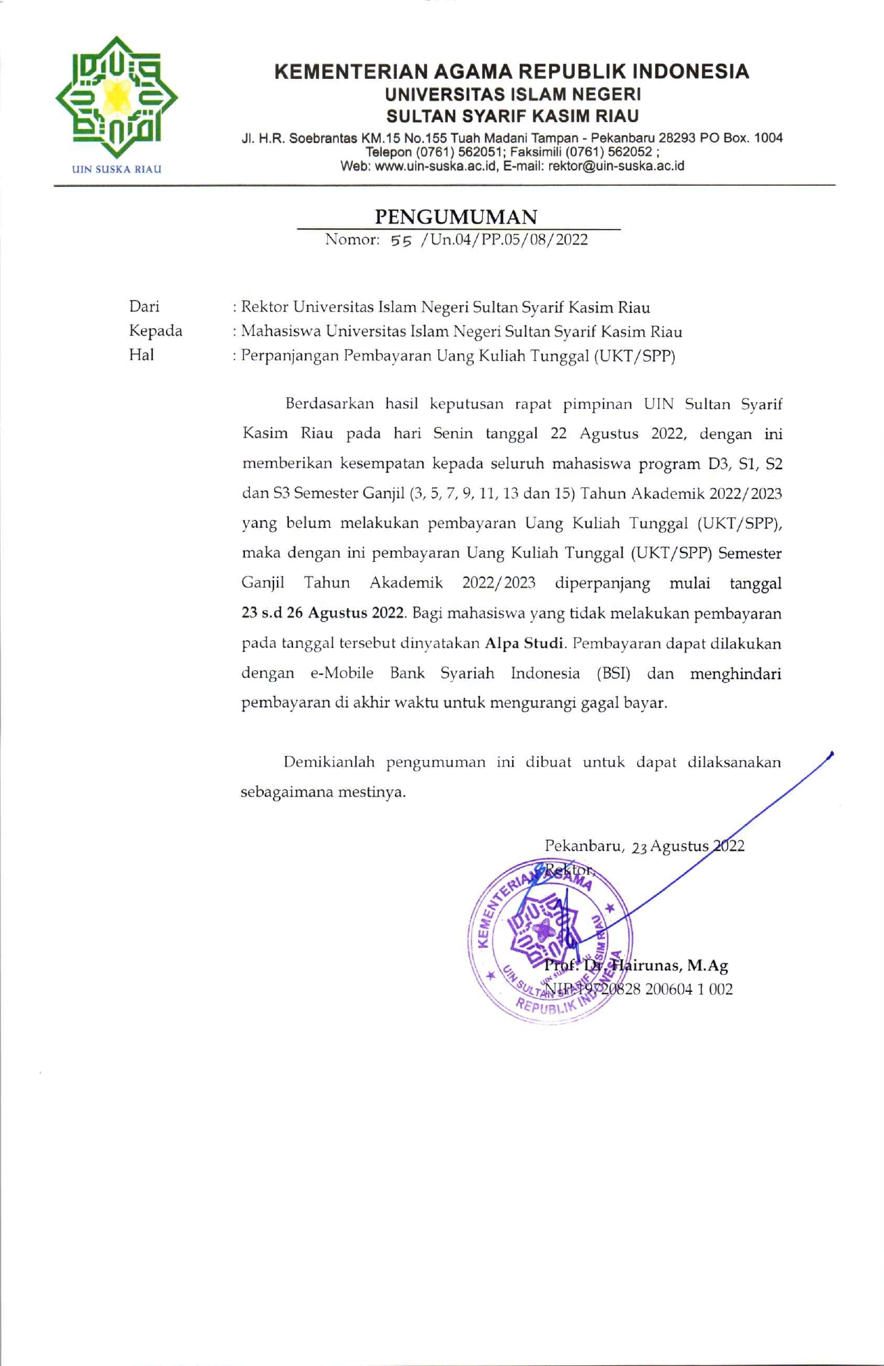 Perpanjangan Pembayaran Uang Kuliah Tunggal (UKT/SPP)
