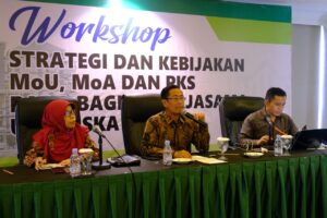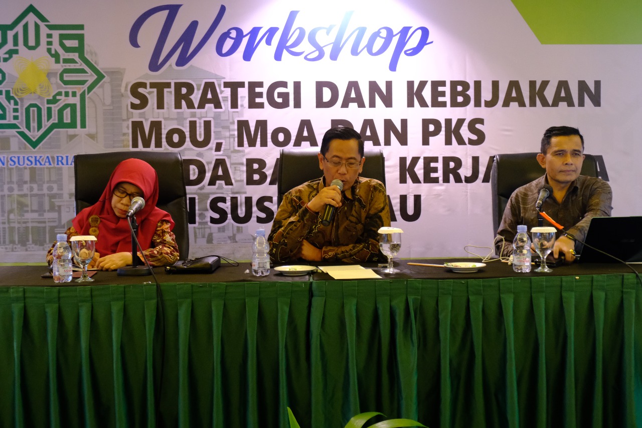 uin-suska.ac.id Dalam rangka memacu dan menyamakan persepsi pelaksanaan kerjasama di lingkungan Universitas Islam Negeri (UIN) Suska Riau, Bagian Kerjasama taja Workshop dengan tema “Strategi dan Kebijakan MoU, MoA dan PKS pada Bagian Kerjasama UIN Suska Riau”, Rabu (09/11/2022). Kegiatan yang dilaksanakan di salah satu Hotel di Pekanbaru ini dihadiri oleh Wakil Rektor III, Biro AUPK, Wakil Dekan III se-UIN beserta satu orang tenaga operator, Kepala UPT dan Lembaga beserta satu orang tenaga operator, BPJS Ketenagakerjaan, BTN Syariah, Kesra Pemprov, UNRI, dan Aulia Hospital seta narasumber yaitu Dr. Idrus Ruslan, M.Ag Wakil Rektor III UIN Raden Intan Lampung dan Prof. Dr. Syaiful Bahri, M.Si Wakil Rektor IV Universitas Riau