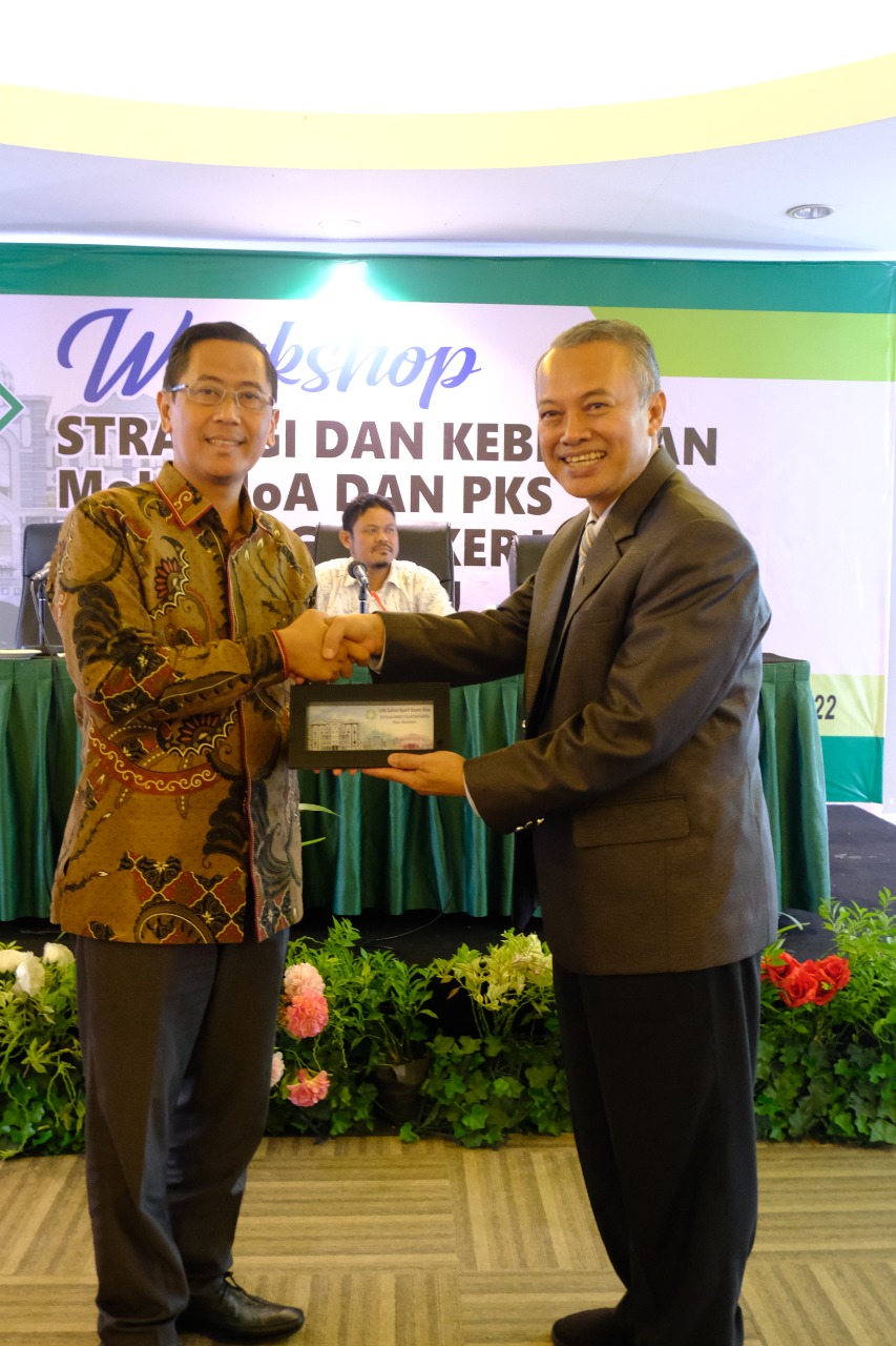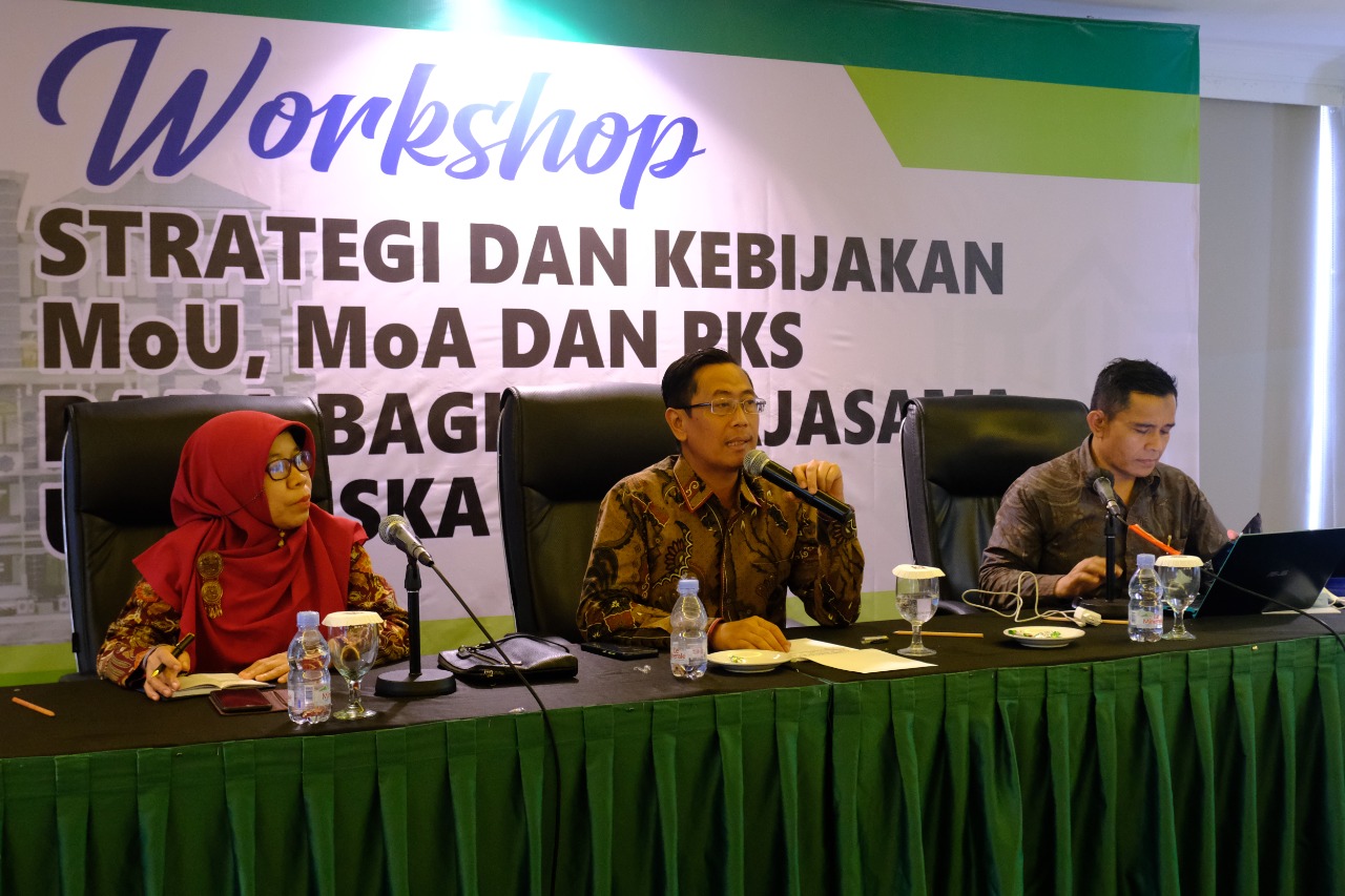 Lebih lanjut Prof. Edi Erwan menyampaikan bagaimana pentingnya MoU ini bagi sebuah institusi Perguruan Tinggi terutama dengan adanya regulasi-regulasi yang mengharuskan kita untuk mengisi ruang-ruang penting yang salah satunya dalam standar Indek Kinerja Utama (IKU). Demikian juga bagaimana pentingnya dalam memenuhi kebutuhan-kebutuhan pengisian borang Akreditasi yang memiliki porsi cukup besar. “Melalui Workshop ini, kita berharap dapat menata kembali dan menggali informasi sehingga bersama-sama mewujudkan kerjasama baik dalam konteks MoU, MoA maupun PKS sehingga tujuan kita sama-sama dapat tercapai”, tegas Edi.