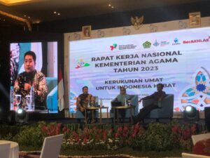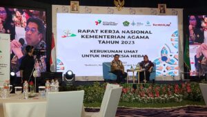Kegiatan Rakernas Tahun 2023 ini mengusung tema “Kerukunan Umat untuk Indonesia Hebat” dibuka langsung oleh Menteri Agama Republik Indonesia K.H. Yaqut Cholil Qoumas. Pelaksanaan kegiatan Rakernas tahun 2023 sangat mengedepankan nilai moderasi bergama hal ini ditunjukkan dengan sajian penampilan yang mengusung nilai keberagaman, yang salah satunya dengan menampilkan pembacaan doa dari 6 perwakilan tokoh agama.