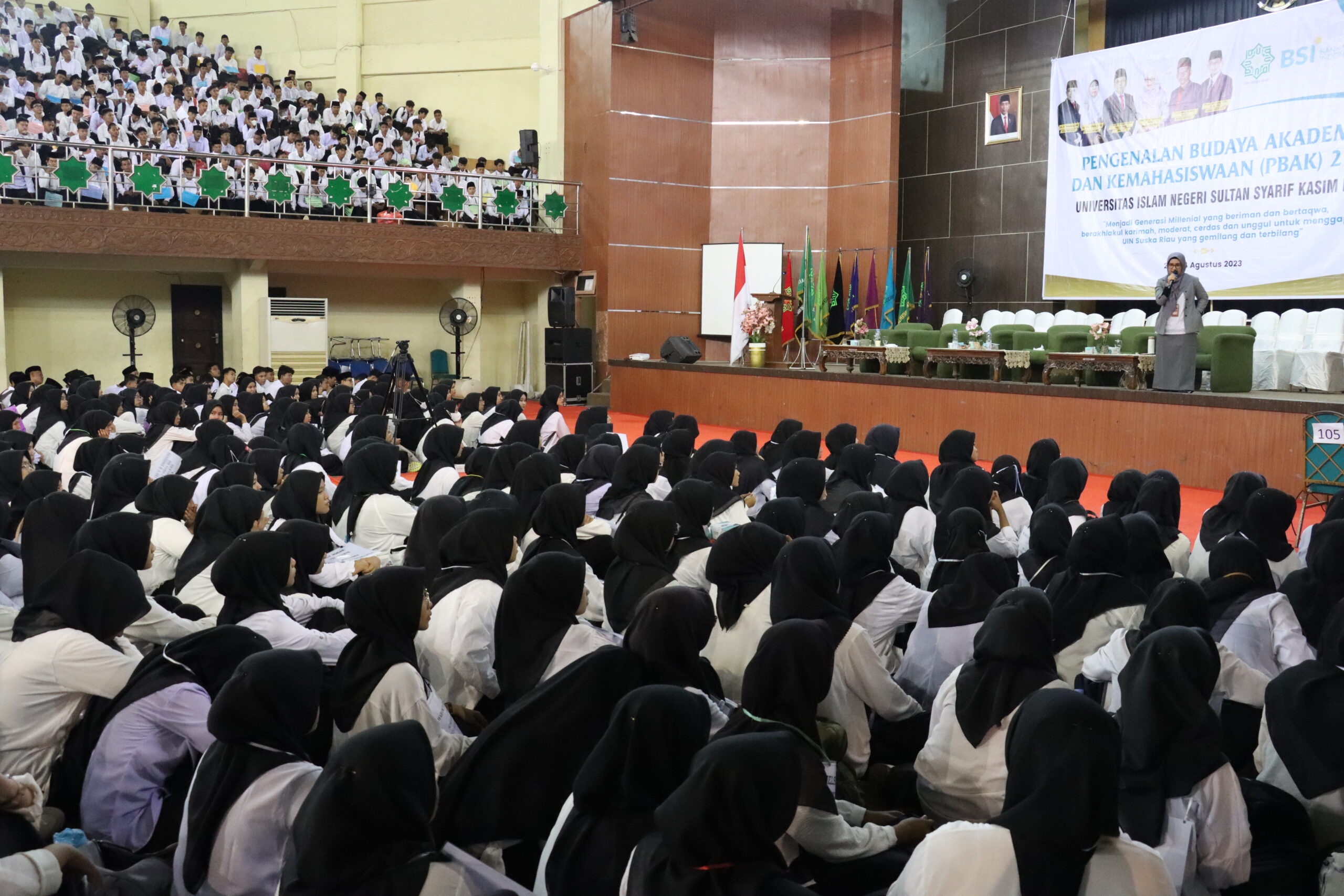 uin-suska.ac.id Hari ke-2 PBAK UIN Sultan Syarif Kasim Riau di Gedung Pusat kegiatan Mahasiswa (PKM) selasa, 22 Agustus 2023 panitia menghadirkan Direktur Human capital Legal PT Hutama Karya Jakarta, Ir. Muhammad Fauzan, ST, MM memberikan orasi ilmiah kepada 2000-an mahasiswa baru yang berjudul ”Wawasan Kebangsaan dan Motivasi Sukses”.