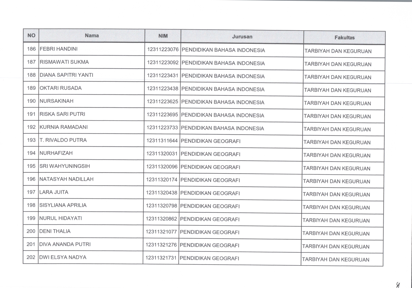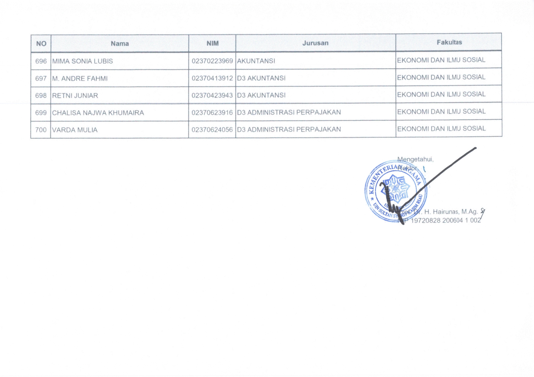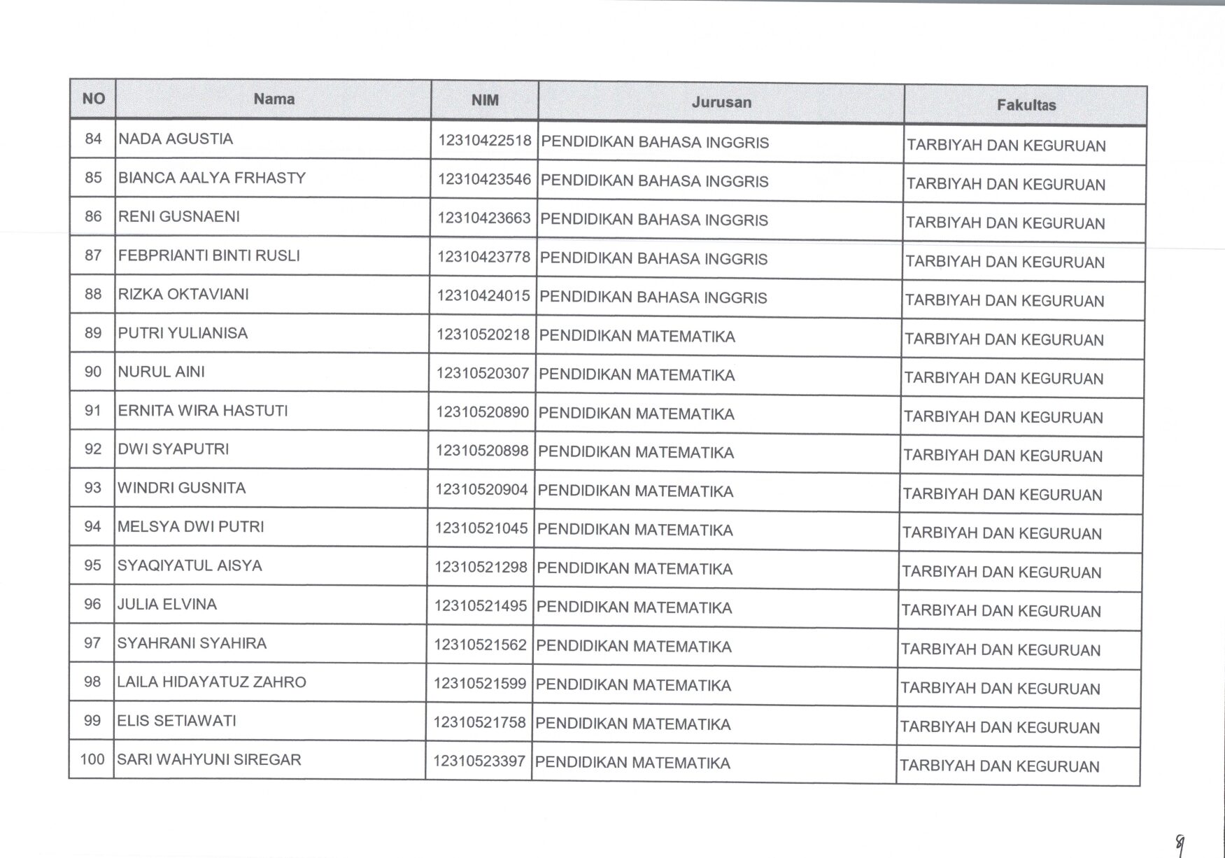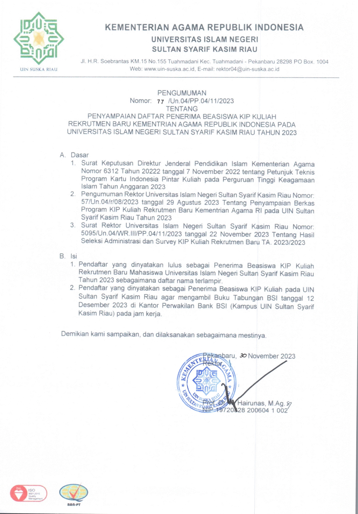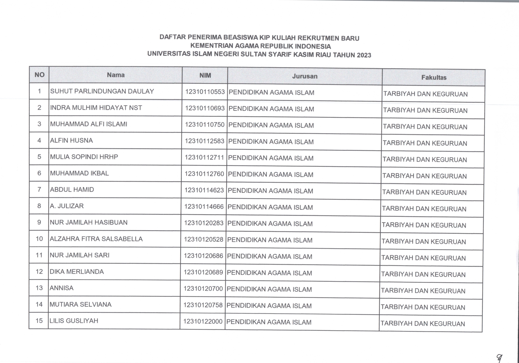 Penyampaian Daftar Penerima Beasiswa KIP Kuliah Rekrutmen Baru Kementerian Agama Republik Indonesia pada UIN Sultan Syarif Kasim Riau Tahun 2023