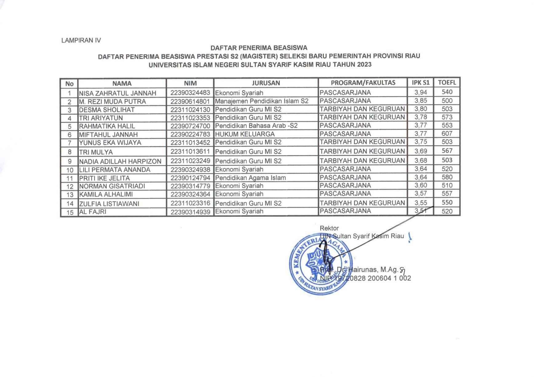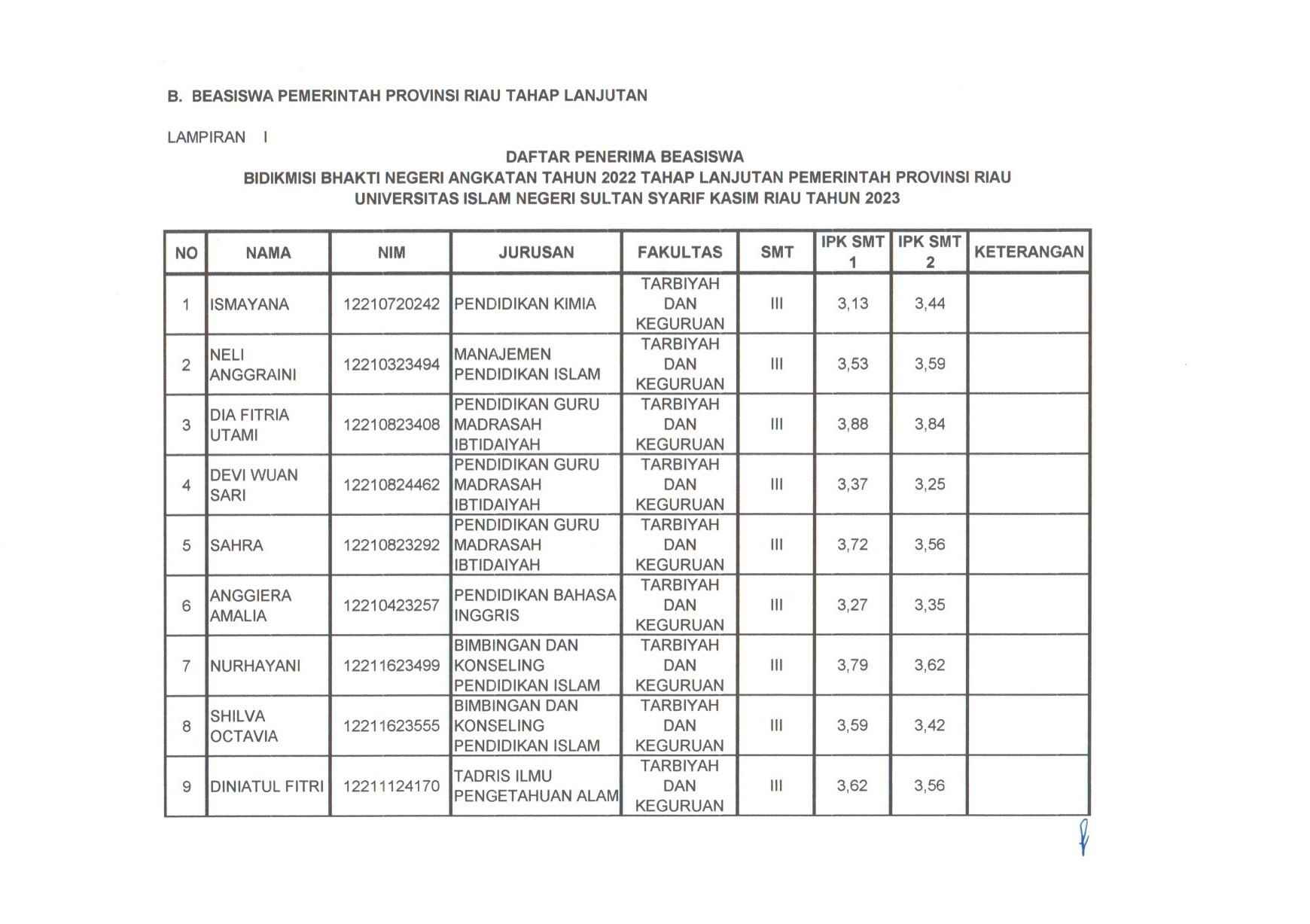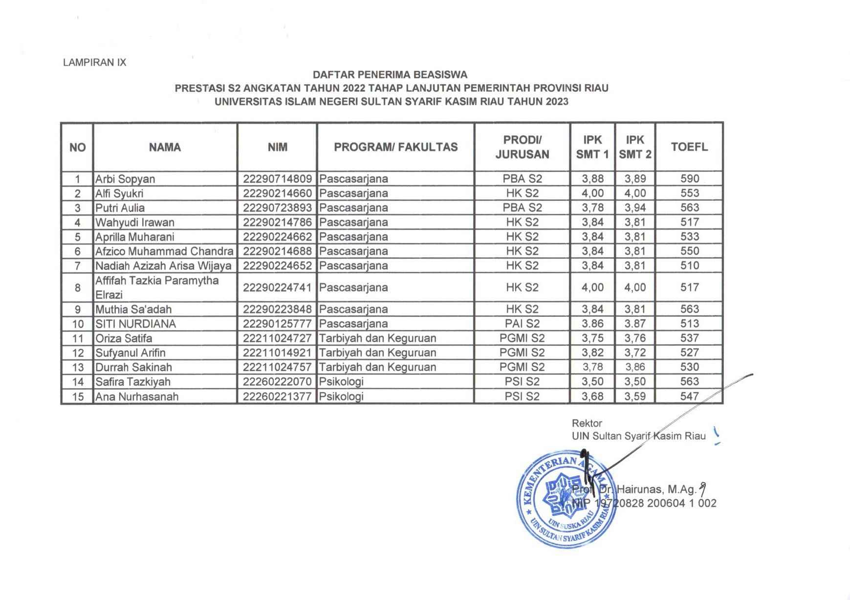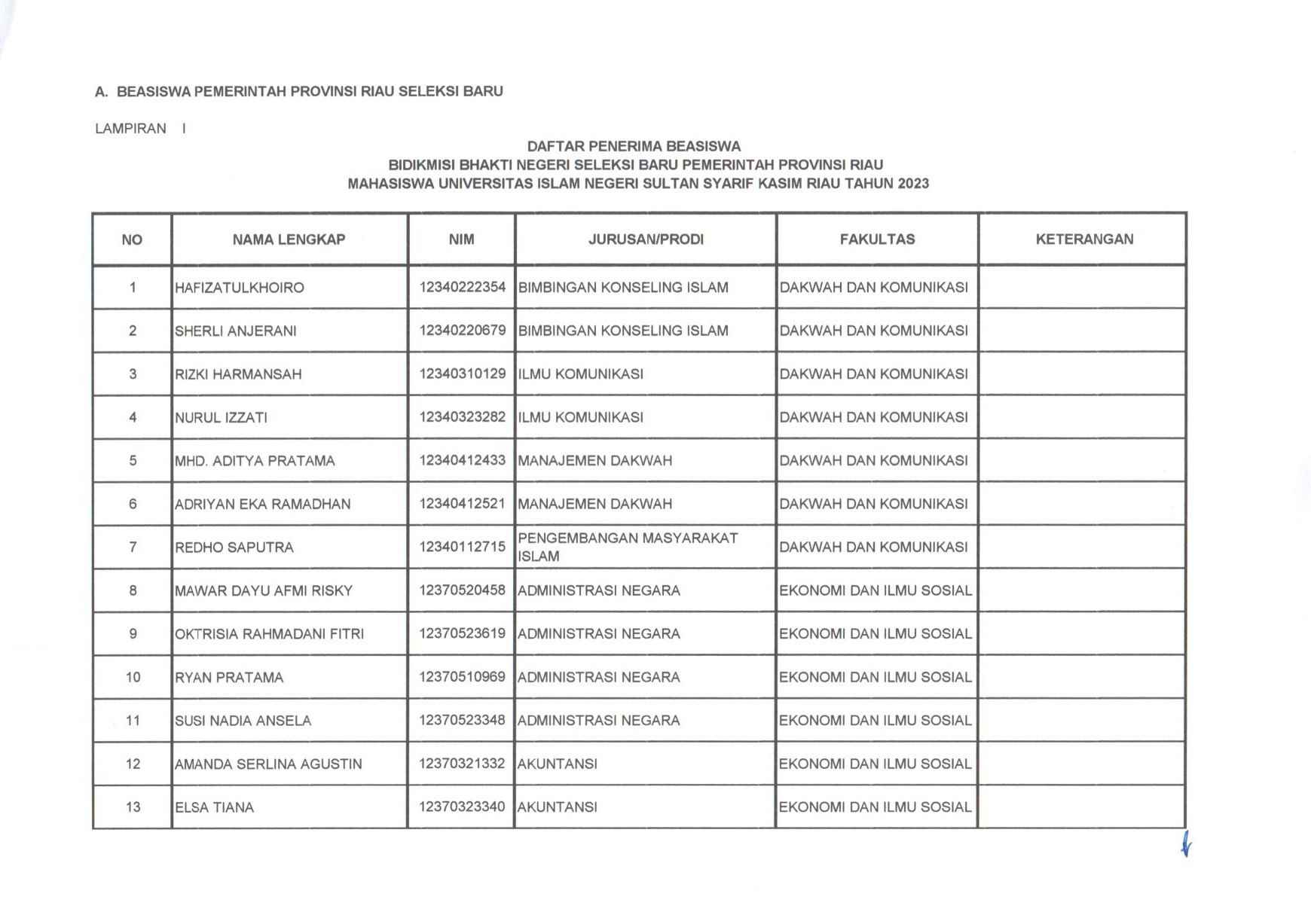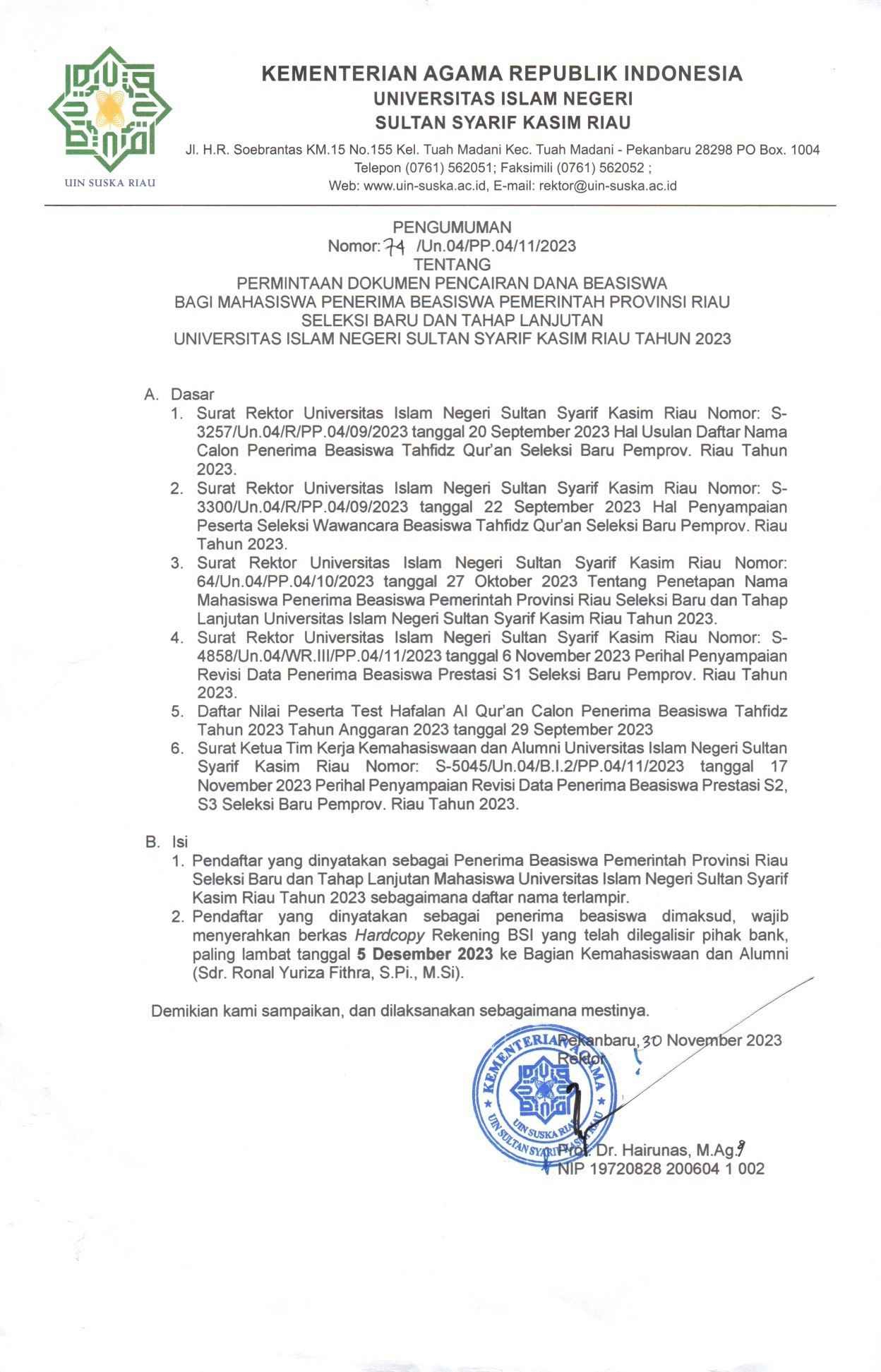 Permintaan Dokumen Pencairan Dana Beasiswa Bagi Mahasiswa Penerima Beasiswa Pemerintah Provinsi Riau Seleksi Baru dan Tahap Lanjutan UIN Sultan Syarif Kasim Riau Tahun 2023