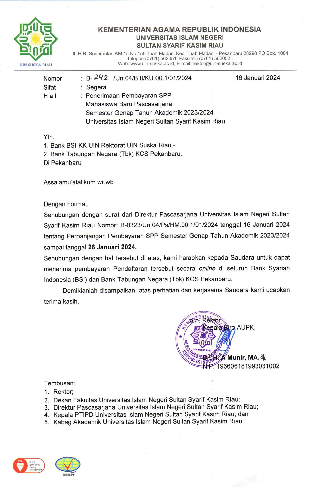 Penerimaan Pembayaran SPP Mahasiswa Baru Pascasarjana Semester Genap Tahun Akademik 2023/2024 Universitas Islam Negeri Sultan Syarif Kasim Riau.