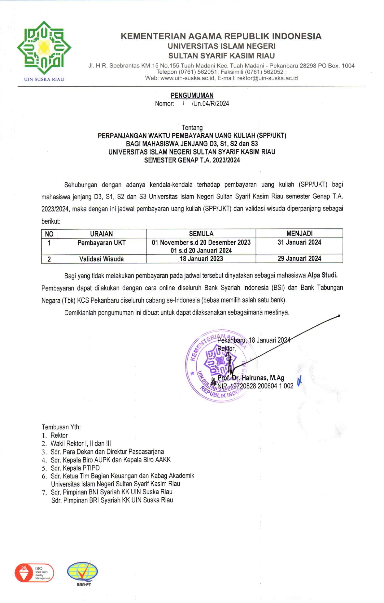 Perpanjangan Waktu Pembayaran Uang Kuliah (SPP/UKT) Bagi Mahasiswa Jenjang D3,S1,dan S3 Universitas Islam Negeri Sultan Syarif Kasim Riau Semester Genap T.A 2023/2024