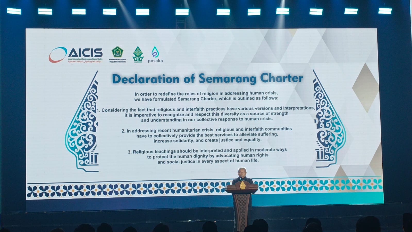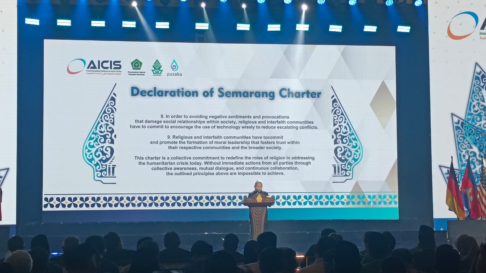 Semarang Charter ini dikukuhkan dibacakan pada saat penutupan AICIS 2024 di Hotel Padma Semarang pada Sabtu malam (03/02/2024) oleh Plt. Rektor UIN Semarang yang juga sebagai Sekjen Kemenag RI dengan dua bahasa (Arab dan Inggris). berikutnya bunyi dari “Semarang Charter”