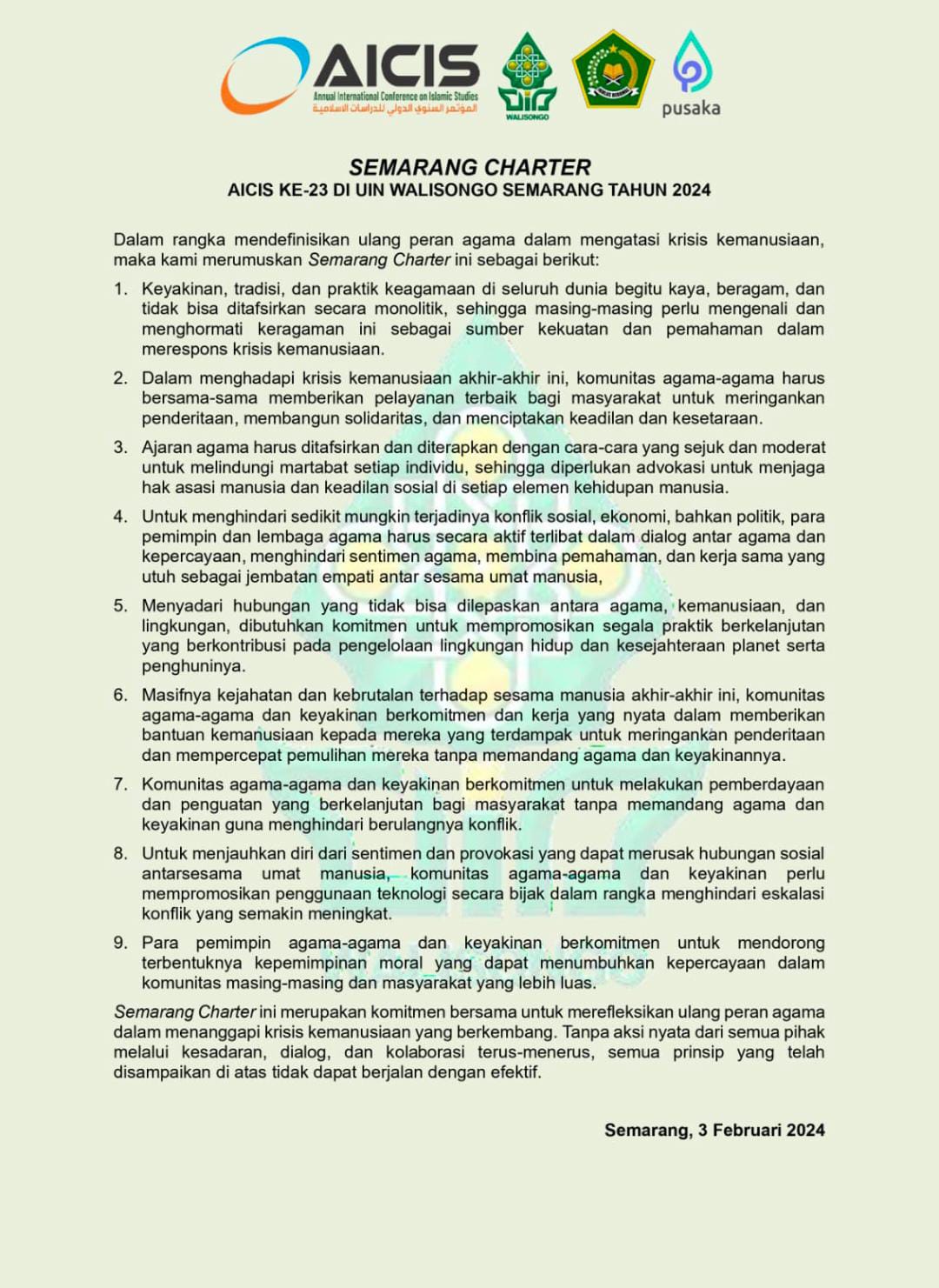 Akhir dari ajang pelaksanaan AICIS 2024 di deklarasikan “Semarang Charter” sebagai rangkaian atas buah pemikiran para peneliti, cendikiawan serta tokoh agama yang hadir dalam kegiatan AICIS 2024 ini.