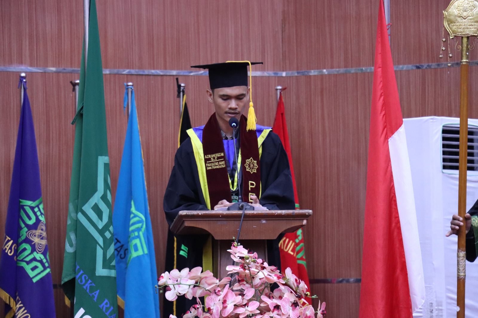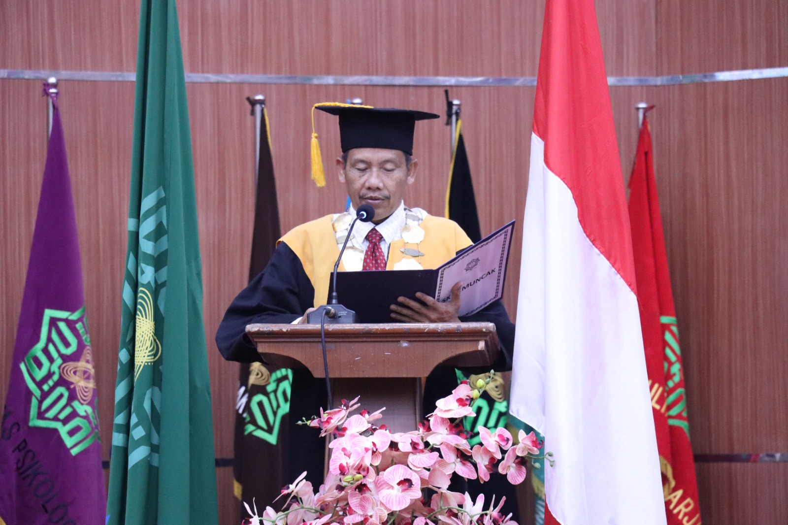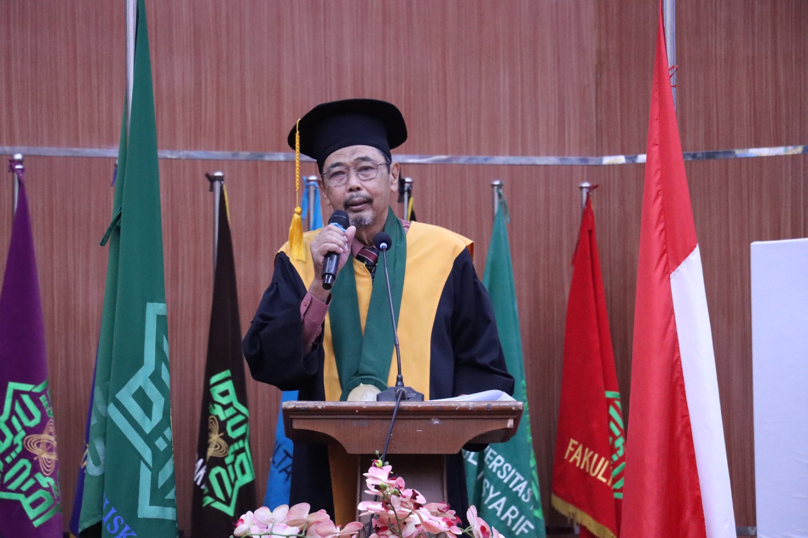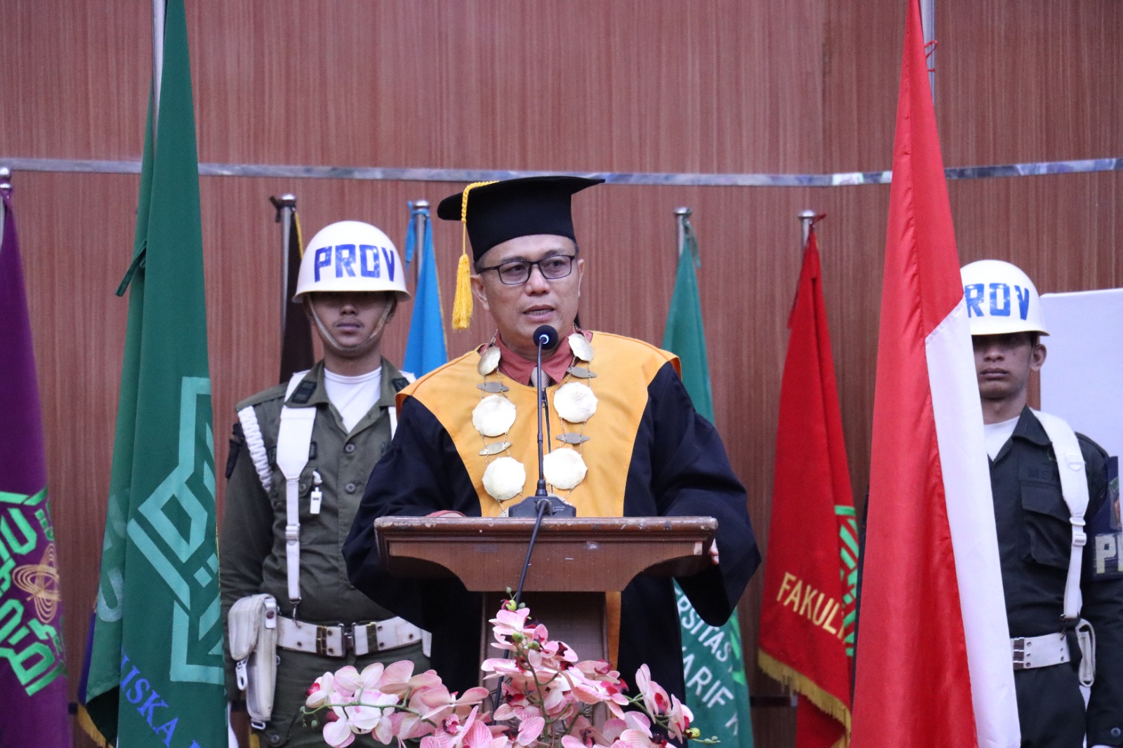 Pada Kesempatan ini Rektor menyampaikan bahwa kita adalah orang-orang hebat, semua kita adalah lulusan-lulusan terbaik pasti akan mendapatkan kesempatan di dunia kerja karena kita tahu bahwa lulusan/alumni kita sudah tersebar dimana-mana. Luar negeri bisa menampung ketika melaksanakan PPL di Thailand, beberapa mahasiswa kita direkrut untuk menjadi guru di Thailand sana. Beberapa mahasiswa UIN Suska Riau yang sudah bekerja dimana-mana tidak luput menjadi orang-orang terdepan di Republik ini, mewakili rakyat Indonesia di parlemen, ini menandakan bahwa kita memiliki kemampuan luar biasa yang patut kita syukuri bersama. Sampai detik ini kita mendapatkan anugrah terbesar setidaknya ada 15 guru besar yang lahir sejak 2021 sampai hari ini. Kita tidak boleh berhenti berjuang karena kita tahu bahwa kita semua ingin mewujudkan satu visi, visi integratif yang berkemajuan untuk mewujudkan keunggulan Universitas Islam Negeri Sultan syarif kasim Riau ini. Terakhir saya ingin pesankan kepada wisudawan wisudawati jangan berhenti berkiprah tunjukan pada dunia bahwa almamater kita ini mampu bersaing dengan universitas bertaraf dunia, sekali lagi capaian ini tidak mudah dicapai kalau kita tidak bertungkus lumus, rasa kesadaran kita untuk kebangkitan bangsa Indonesia yang teramat kita cintai ini”, ucap Rektor.