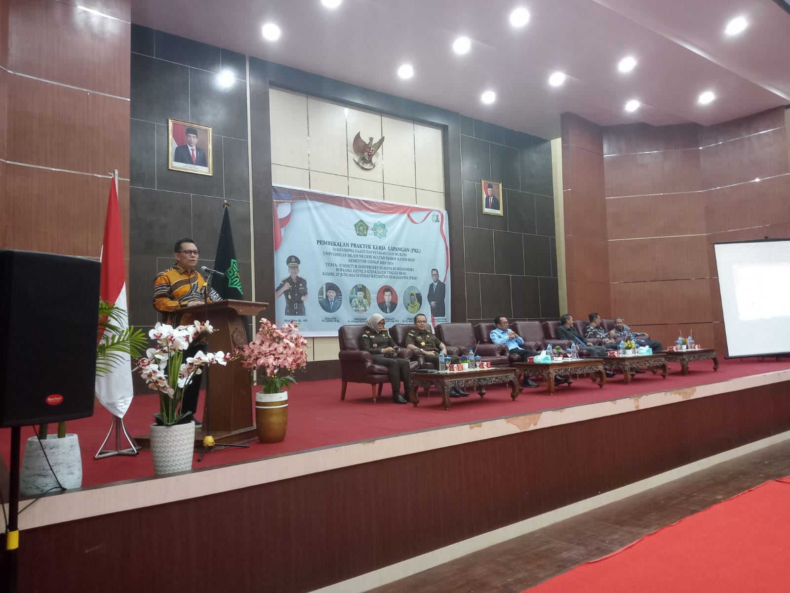 Pasca prosesi penandatangan Nota Kesepahaman, Kepala Kejari Riau, Akmal Abbas, SH., MH dijemput dengan penuh hormat menjadi narasumber kegiatan pembekalan PKL mahasiswa Fakultas Syariah dan Hukum. Pada kesempatan ini, Kepala Kejati Riau mengangkat tema tentang “Peran dan Tugas-Fungsi Kejaksaan di Indonesia”. Beberapa poin penting yang disampaikan oleh Akmal Abbas, SH.,MH terkait dengan wewenang kejaksaan, kolaborasi dengan kepolisian (Polri), Restorative Justice yang didasarkan asas profesionalitas, dan keadilan,
