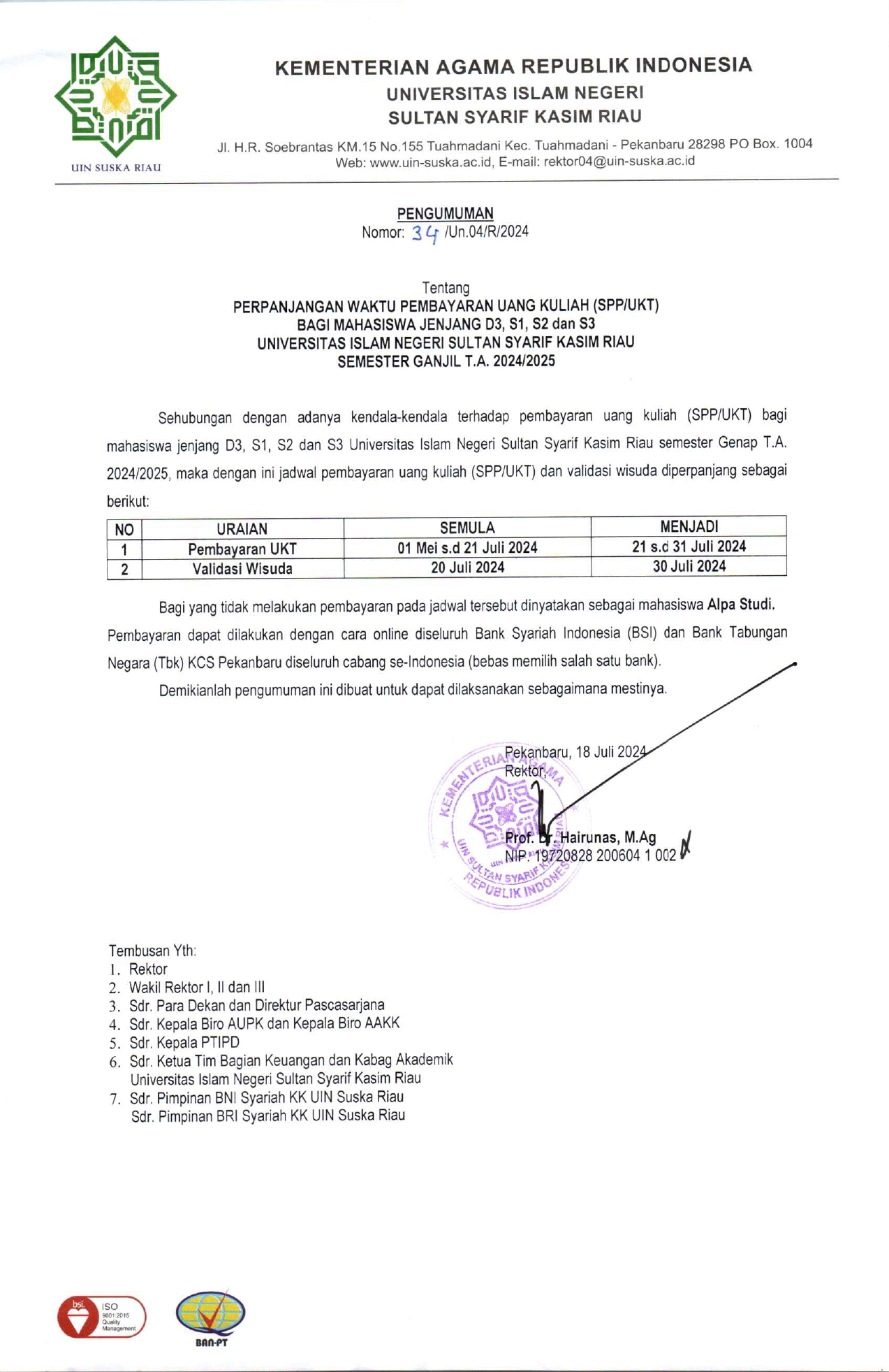 Perpanjangan Waktu Pembayaran Uang Kuliah Tunggal (UKT) Bagi Mahasiswa Jenjang D3, S1, S2, dan S3 Universitas Islam Negeri Sultan Syarif Kasim Riau Semester Ganjil TA 2024/2025.