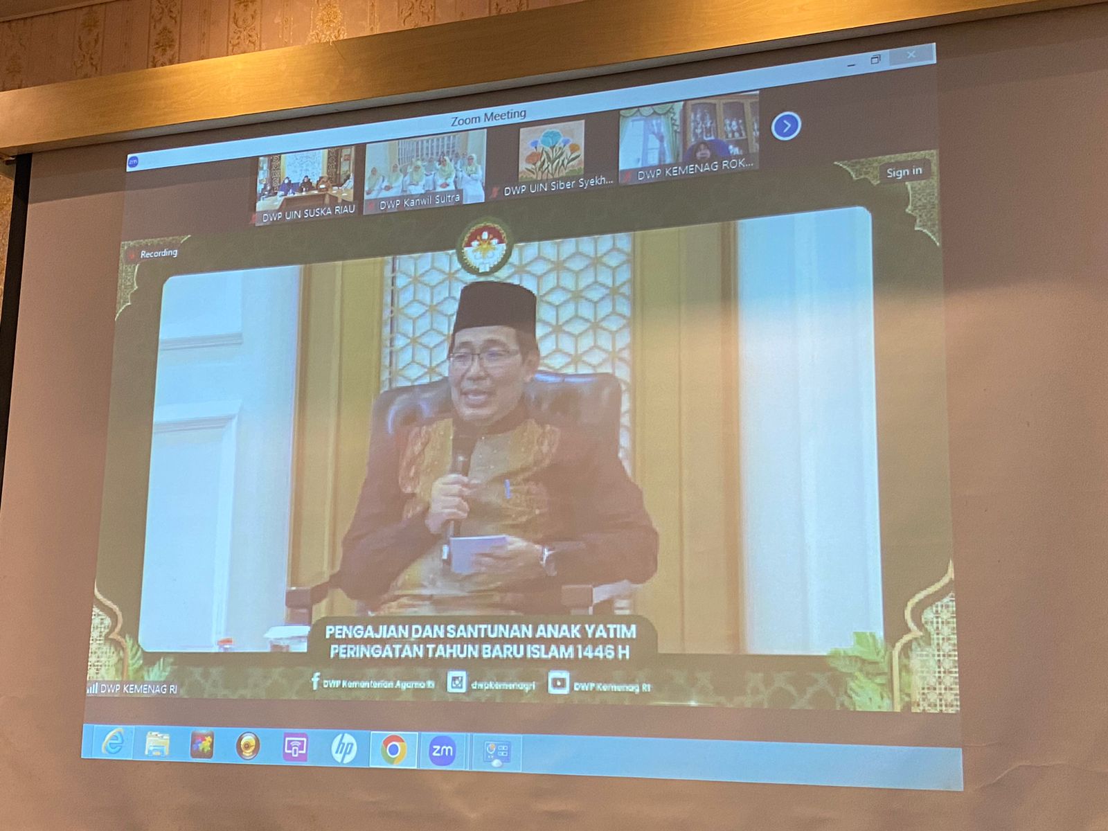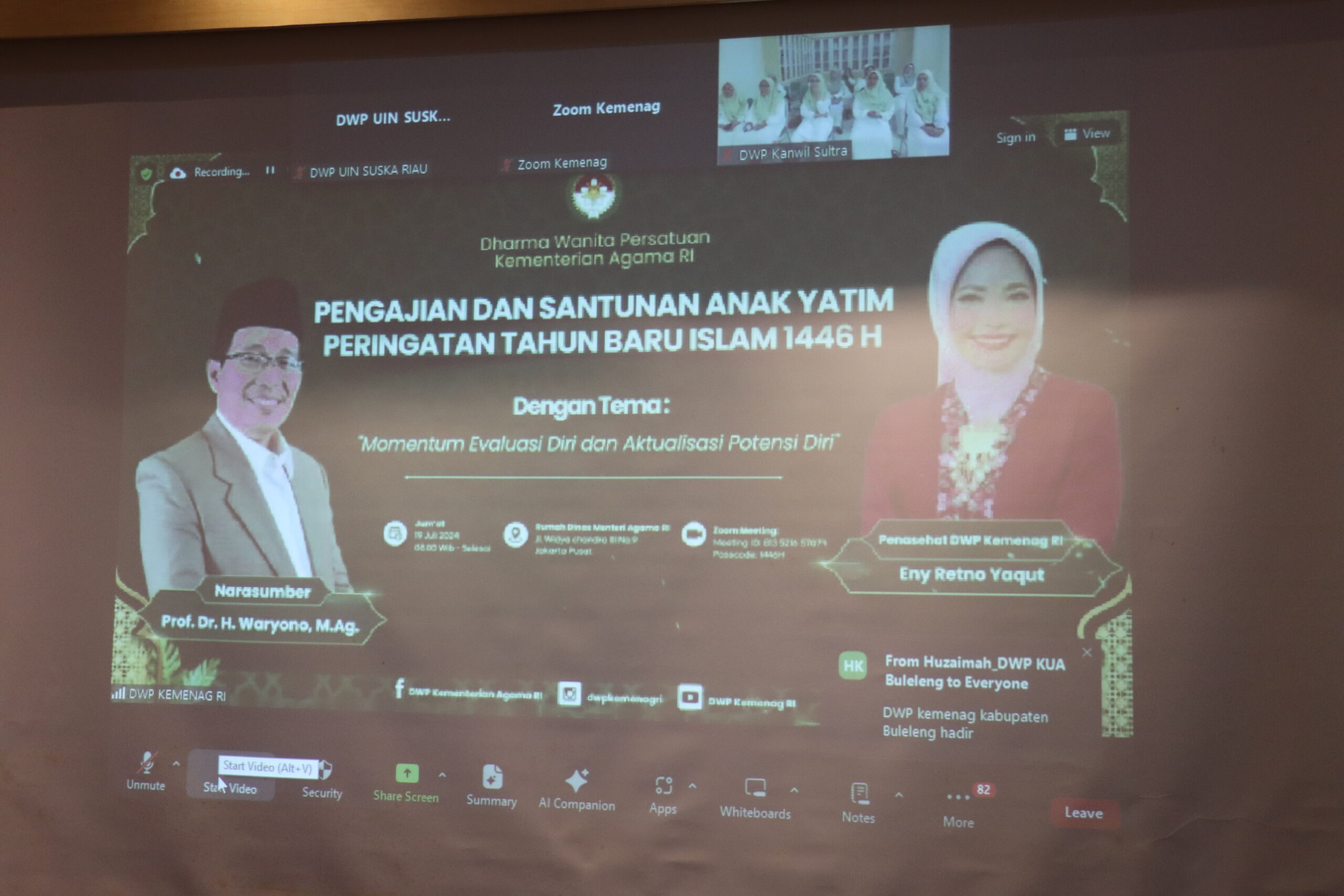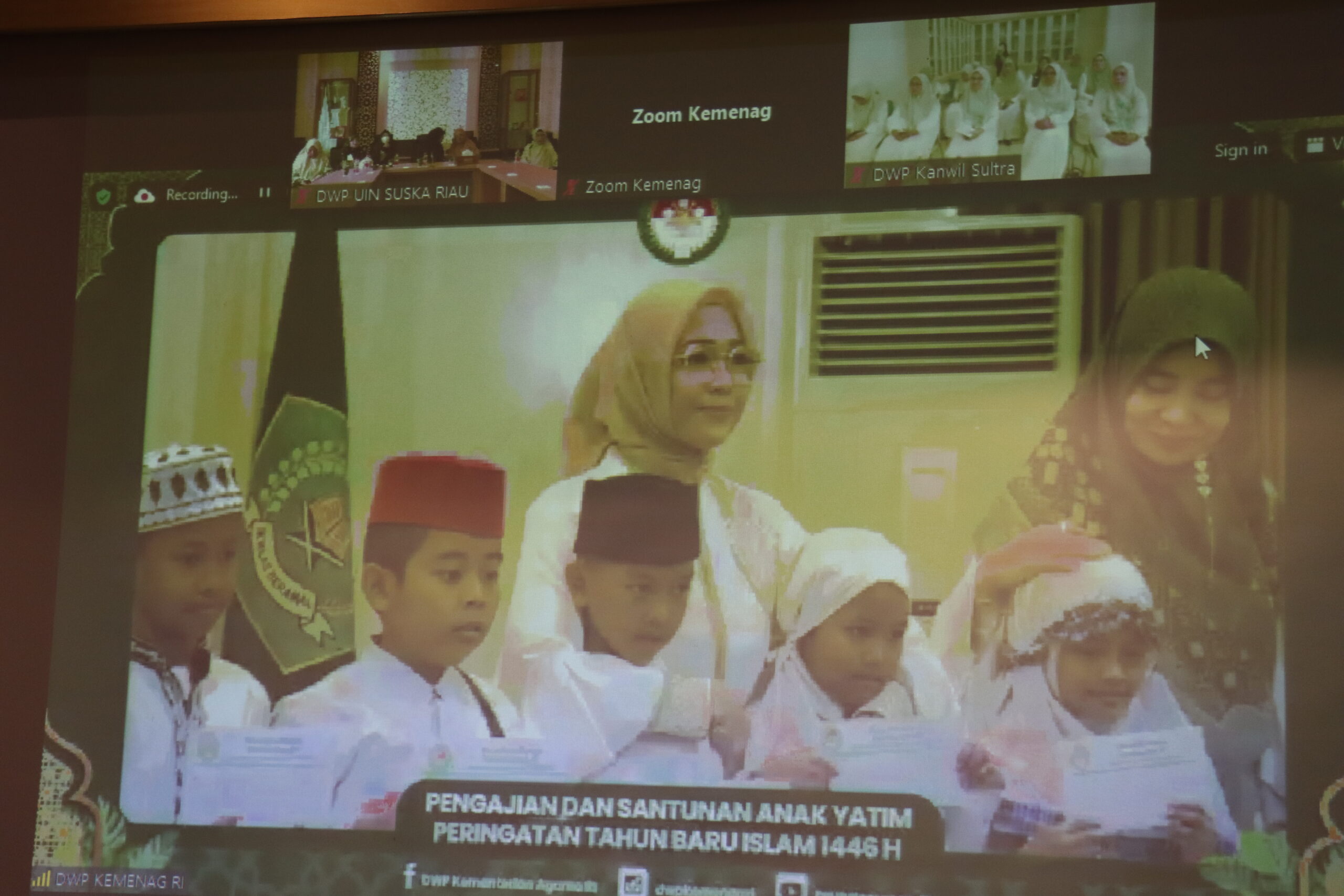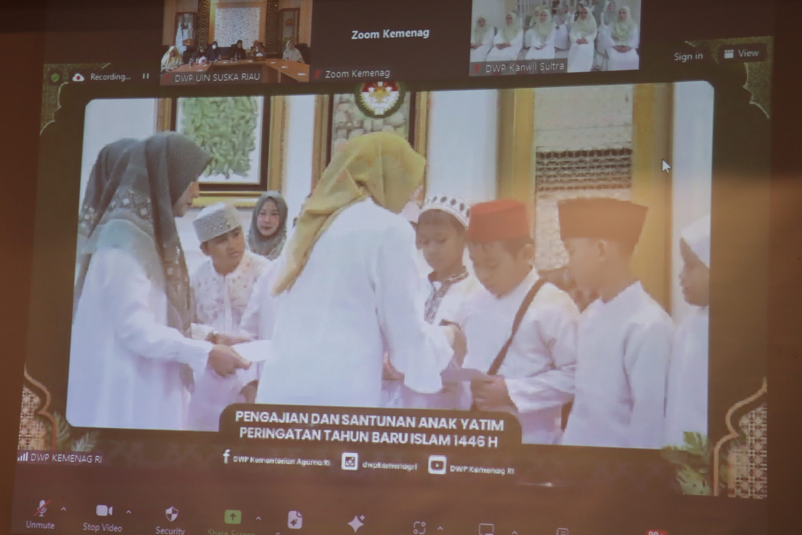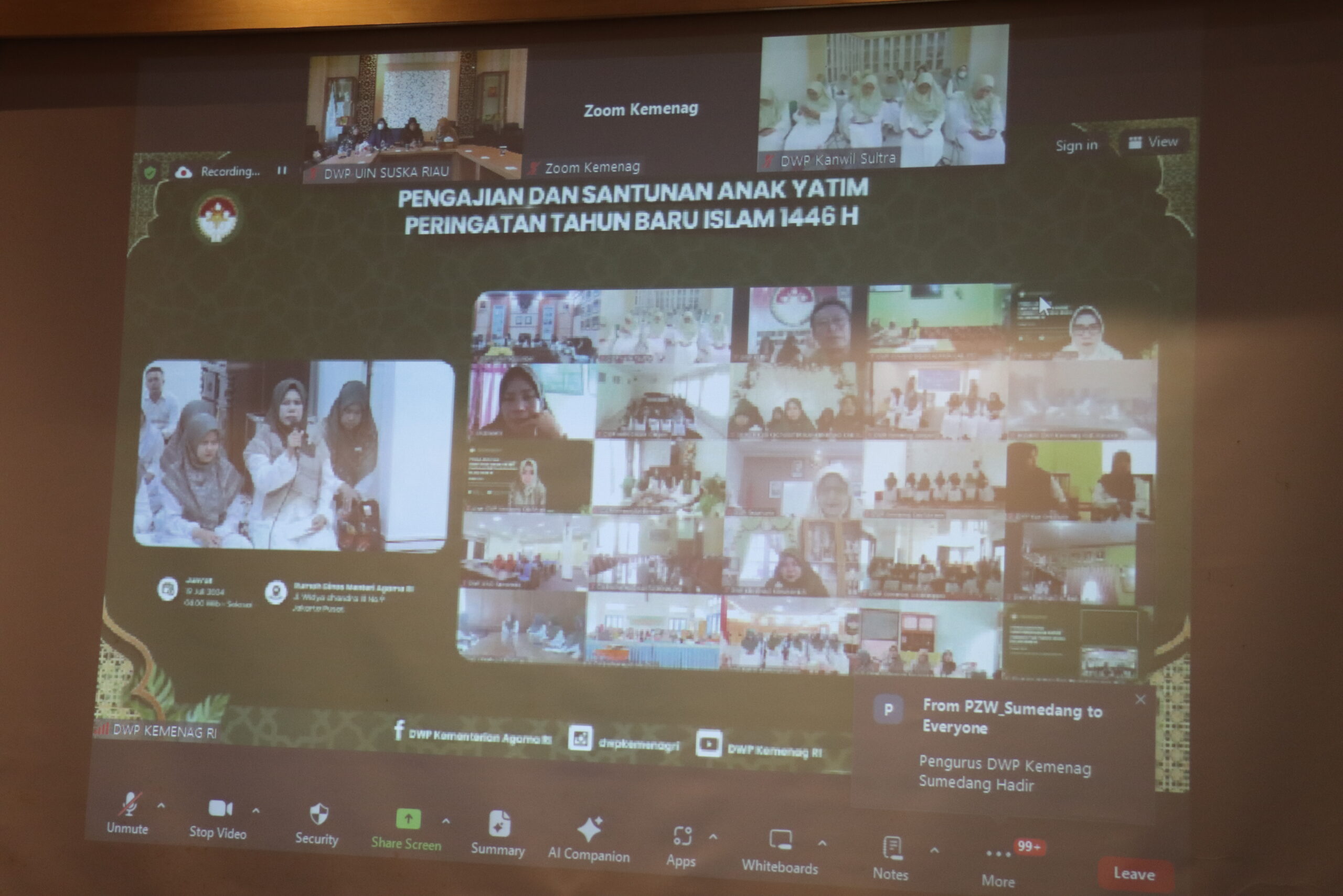 uin-suska.ac.id Dharma Wanita Persatuan (DWP) Universitas Islam Negeri Sultan Syarif Kasim Riau aktif berpartisipasi dalam acara pengkajian dan santunan untuk anak yatim dalam rangka peringatan Tahun Baru Islam 1446 Hijriyah dengan Tema “Momentum Evaluasi Diri dan Aktualisasi Potensi Diri”. Acara ini merupakan bagian dari serangkaian kegiatan yang diadakan secara serentak oleh DWP Kementerian Agama di seluruh Indonesia melalui platform Zoom Meeting, bertempat di Ruang Rapat Perpustakaan UIN Suska Riau, Jumat, 19 Juli 2024.