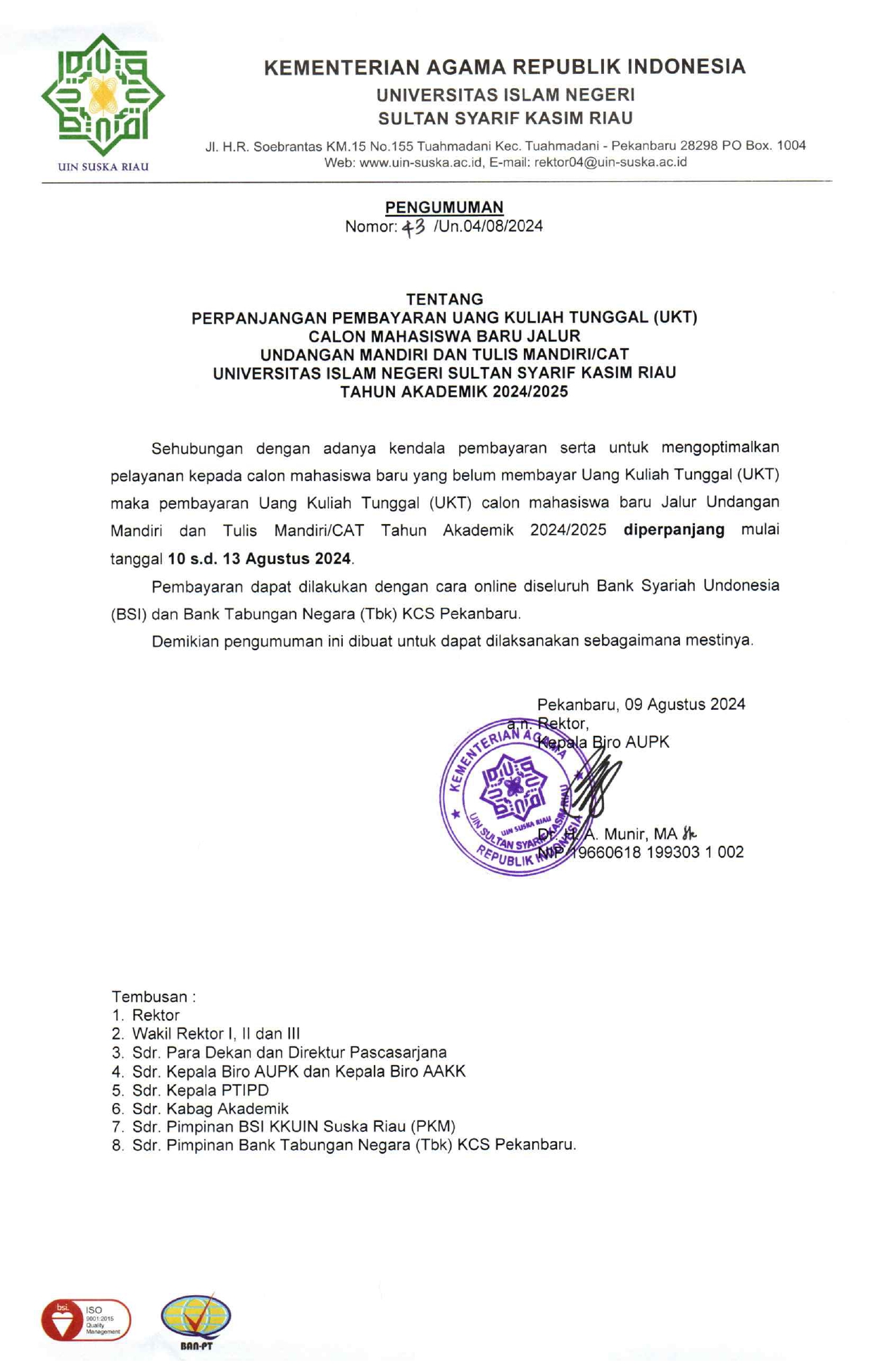 Perpanjangan Pembayaran Uang Kuliah Tunggal (UKT) Calon Mahasiswa Baru Jalur Undangan Mandiri dan Tulis Mandiri/CAT Universitas Islam Negeri Sultan Syarif Kasim Riau Tahun Akademik 2024/2025