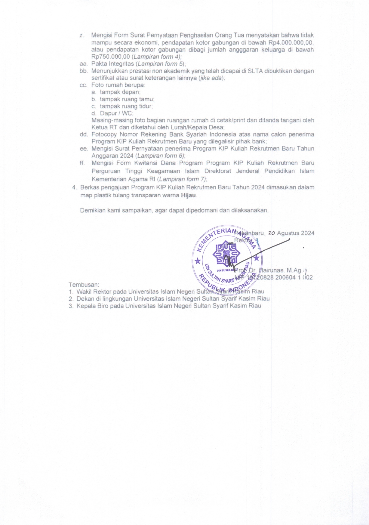 Penyampaian Berkas Program KIP Kuliah Rekrutmen Baru Kementerian Agama RI Pada UIN Sultan Syarif Kasim Riau Tahun 2024