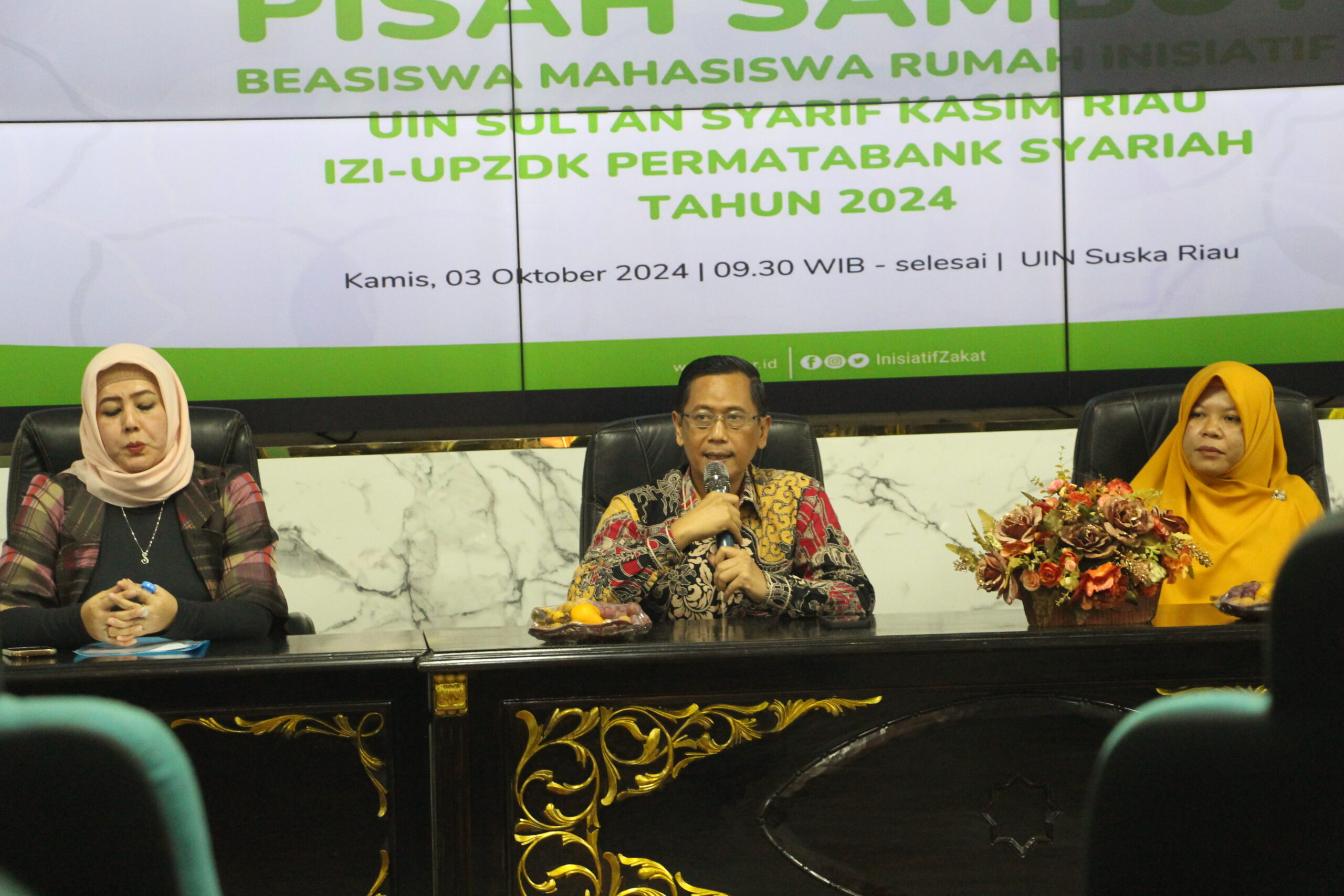 Dalam sambutannya, Wakil Rektor III UIN Suska Riau, Edi Erwan, mengungkapkan rasa syukur dan kebanggaannya atas terselenggaranya acara tersebut. “Alhamdulillah, ini merupakan suatu keberkahan bagi kita semua, khususnya bagi mahasiswa UIN Suska Riau. Dari sekian banyak kampus yang ada di Riau, kampus kita menjadi yang pertama menerima manfaat program ini. Mari kita bersyukur kepada Allah SWT atas kegiatan yang berlangsung pada pagi ini, penyerahan beasiswa kepada mahasiswa serta pelepasan wisudawan yang selama ini telah menerima manfaat dari IZI,” ujar Edi Erwan.