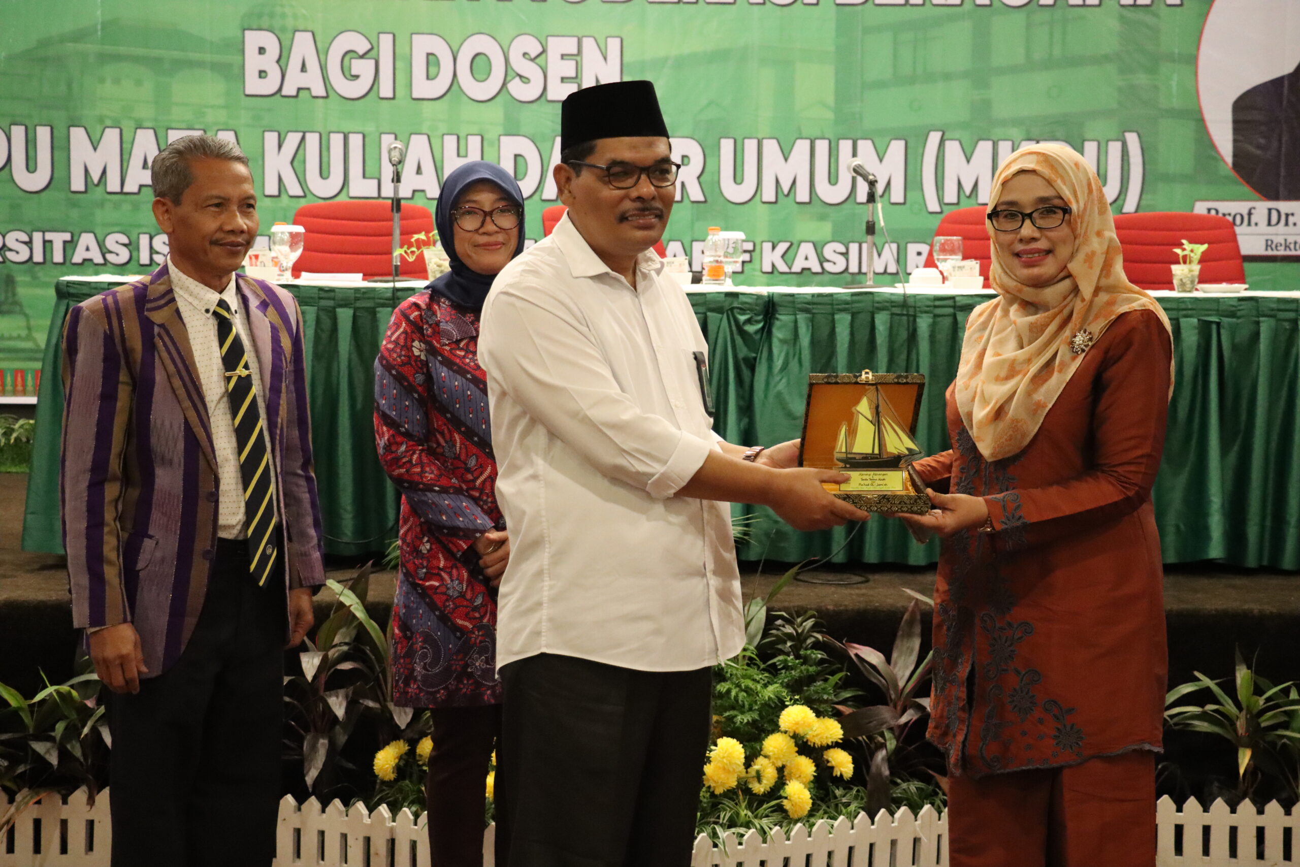 Akhir acara, Panitia menyerahkan cendera mata kepada narasumber, Dr. Iklilah Muzayyanah Dini Fajriyah, M.Si, sebagai bentuk apresiasi atas kontribusinya dalam memberikan materi pembekalan kepada para dosen.
