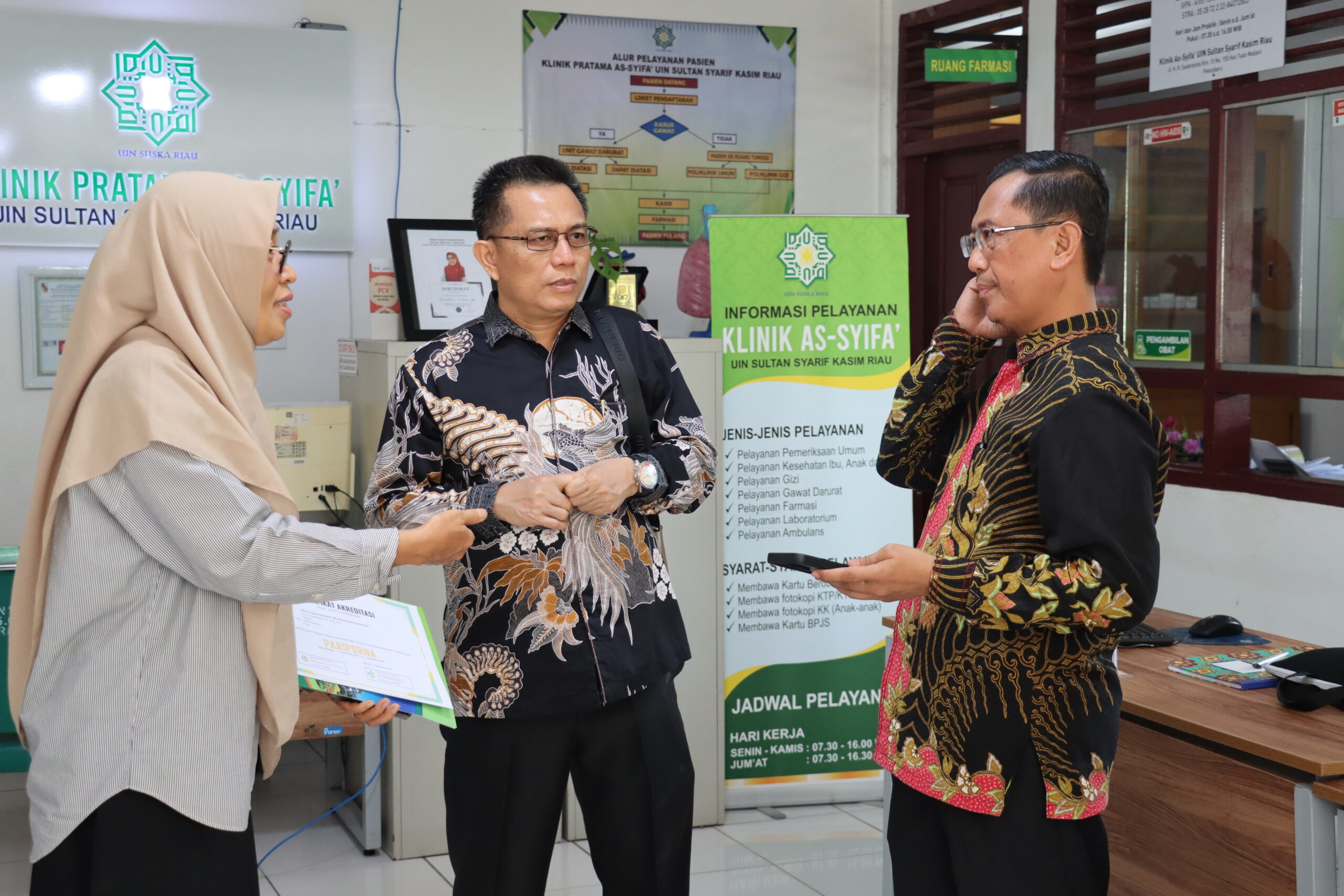 Rektor Universitas Islam Negeri Sultan Syarif Kasim Riau Prof. Dr. Khairunnas Rajab, M.Ag saat mendapatkan informasi tentang perolehan Akreditasi “Paripurna” untuk Klinik As-Syifa’ langsung turun ke Klink yang didampingi oleh Wakil Rektor II dan III, Kasubbag TU/RT serta Kabag Akademik untuk memberikan ucapan selamat.
